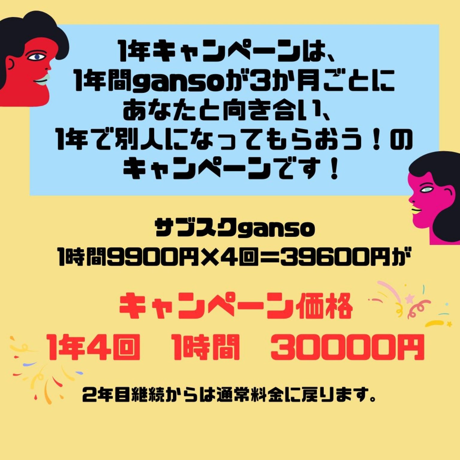 【顔に表れているあなたの長所・個性、活かせていますか?】 顔にはあなたの今まで築き上げてきた人生・経験が刻まれています。 顔を見ることは自分自身を客観視することになります。 自分と客観的に向き合うことは自分の人生と向き合うということ。 自分の個性・長所と向き合い、活かしてもっと楽に、そして今より輝く事業開拓を! 3か月で顔は変わります。 3か月ごとにあなた自身と向き合い、自分を客観視しませんか? gansoが1周年を迎えるということで、1年間あなたと特別価格で向き合います。 最初で最後のキャンペーンになると思います。 私も人生をかけて、gansoのプライドと自信をかけてあなたと向き合います。 無意識の自分と向き合って自分改革。 あなたの人生を変える1年にしませんか? ※1年間終了時にアンケートをお願いします。アンケートご協力いただける方のみお願いいたします。