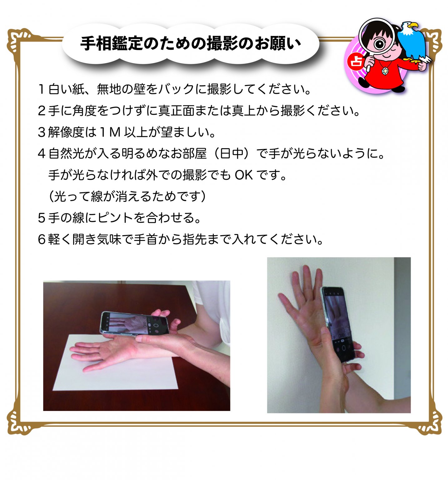 手相鑑定のための写真撮影のご注意をよく見て、両手のひらの写真をお送りください。