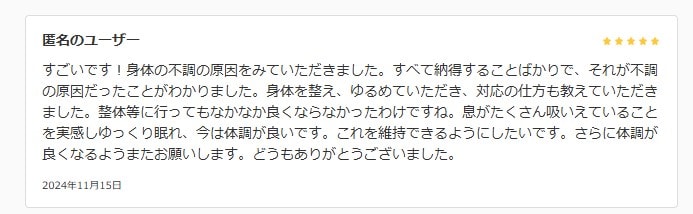 すごいです!身体の不調の原因をみていただきました。すべて納得することばかりで、それが不調の原因だったことがわかりました。身体を整え、ゆるめていただき、対応の仕方も教えていただきました。整体等に行ってもなかなか良くならなかったわけですね。息がたくさん吸いえていることを実感しゆっくり眠れ、今は体調が良いです。これを維持できるようにしたいです。さらに体調が良くなるようまたお願いします。どうもありがとうございました。