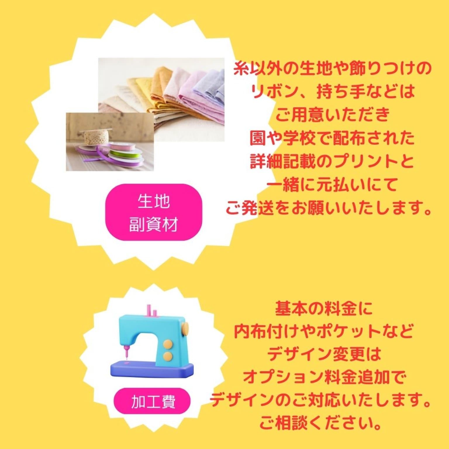 ⑥お打ち合わせで決定した内容、糸以外の必要材料などをご購入いただき、当アトリエまで元払いにてご発送をお願いいたします。また、生地などと一緒に、入学入園先から配られた準備品に関しての詳細プリントのコピーもお忘れなく同梱発送をお願いたします。