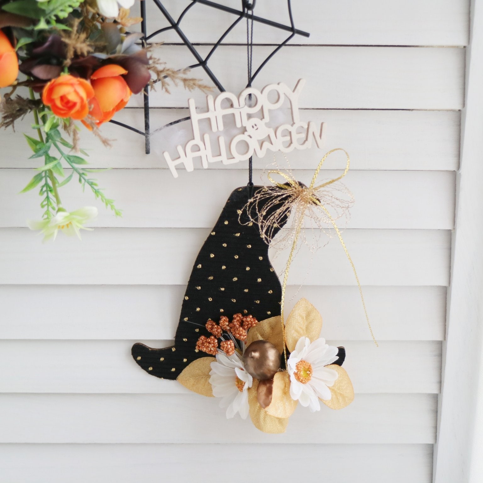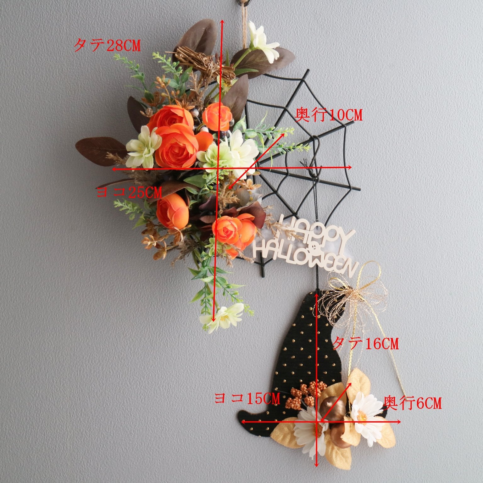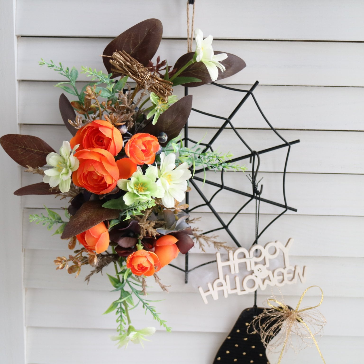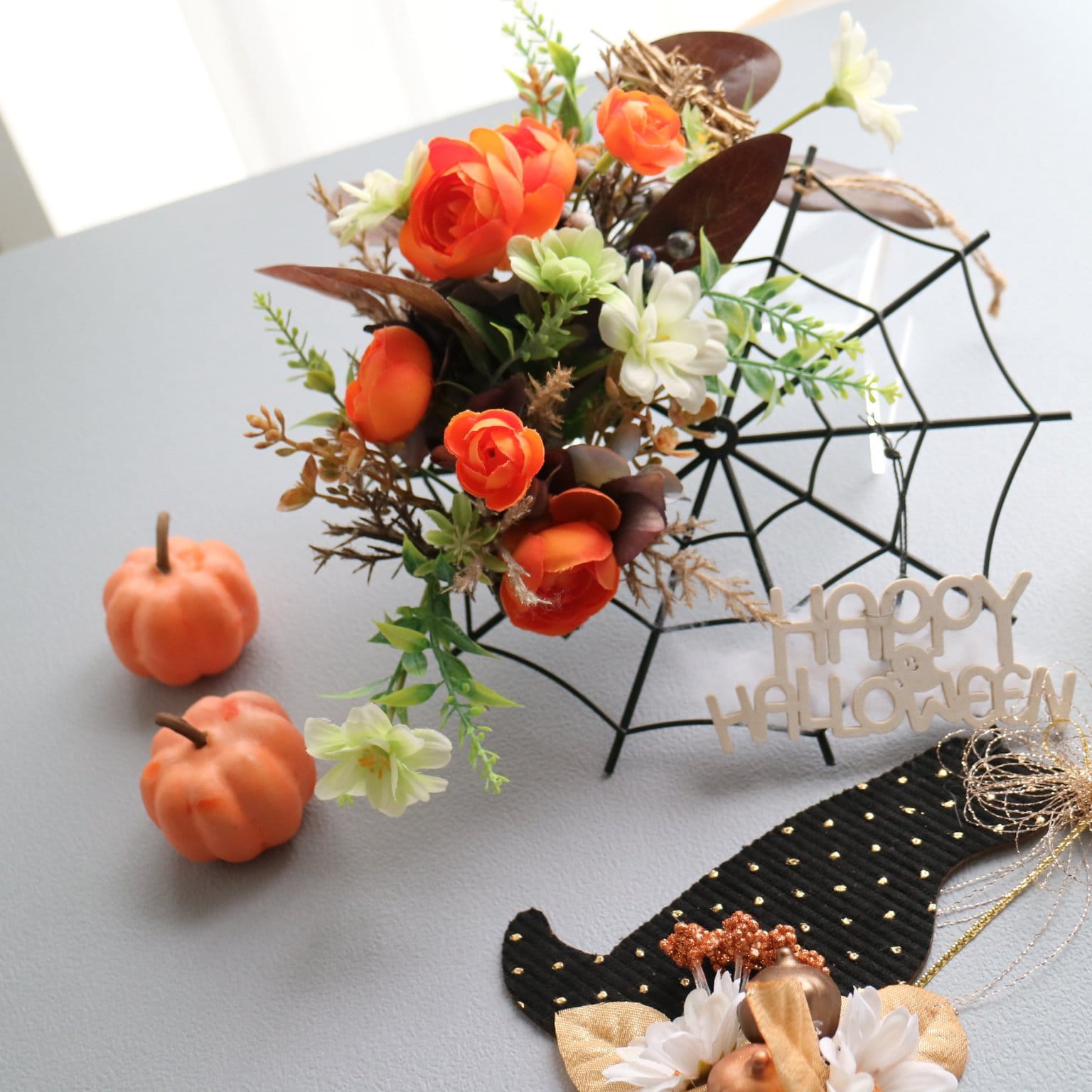 【2025年10月】アイアン素材のクモの巣フレームが可愛い!ハロウィン壁掛けアレンジ 造花アレンジ 八王子|フラワー通販ショップ&レッスン|スターリリーフラワーズ リアル感たっぷりのクモの巣フレームをベースに、オレンジのバラや実ものを主役にした華やかな壁掛けアレンジを作ります。高品質なアーティフィシャルフラワーを使用するので、水やり不要✨毎年繰り返し飾っていただけます。さらに魔女の帽子木製プレートにもアレンジし「HAPPY HALLOWEEN」プレートで、ぐっとハロウィン気分に