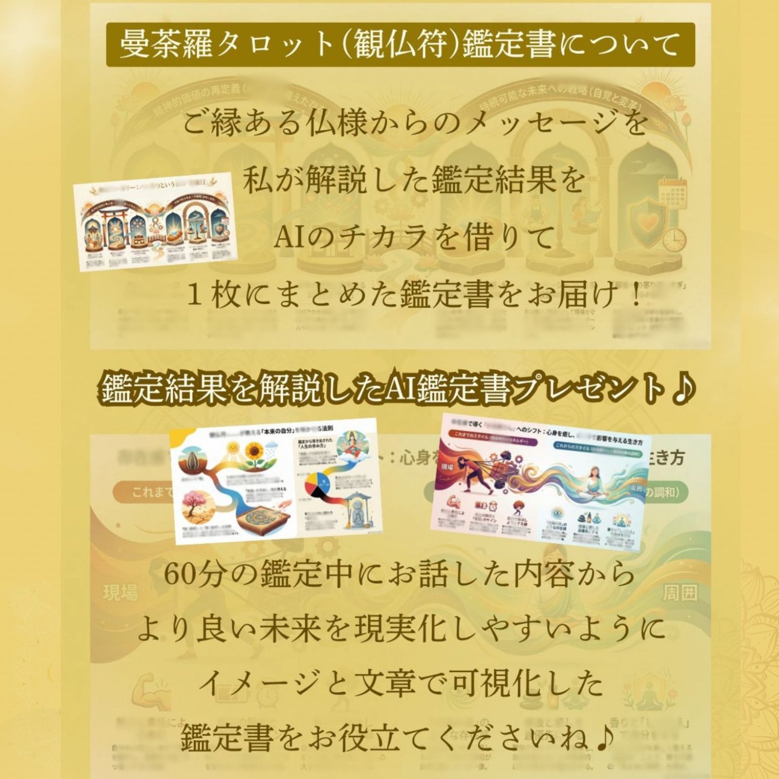 ご縁ある仏様からのメッセージを私が解説した鑑定結果をAIのチカラを借りて1枚にまとめた鑑定書を後日、お届け致します。
