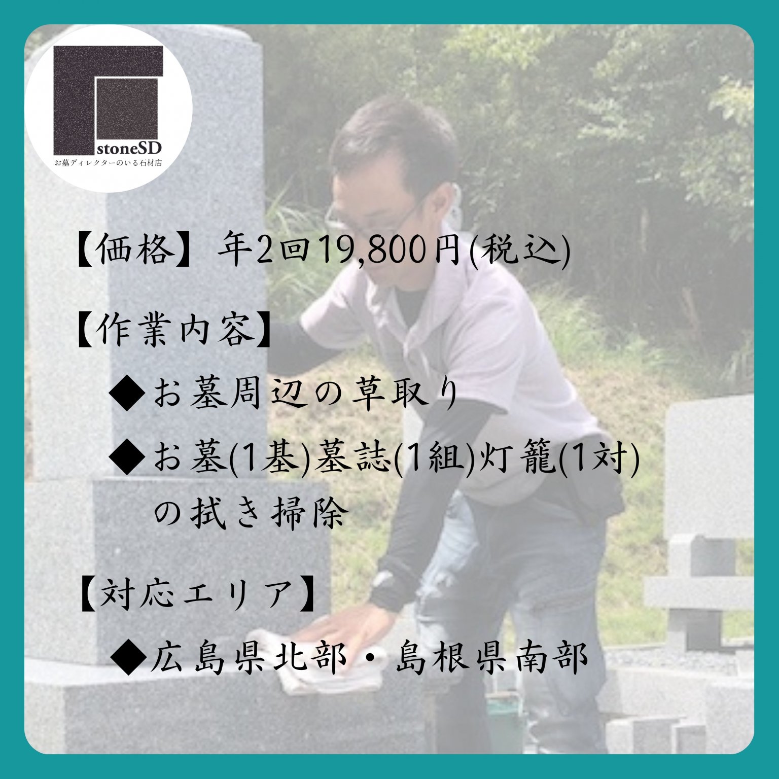 また、広い墓地(9㎡以上)や手入れのされていない墓地、2基以上のお墓がある方は、別途割り増し料金がかかる場合がございます。