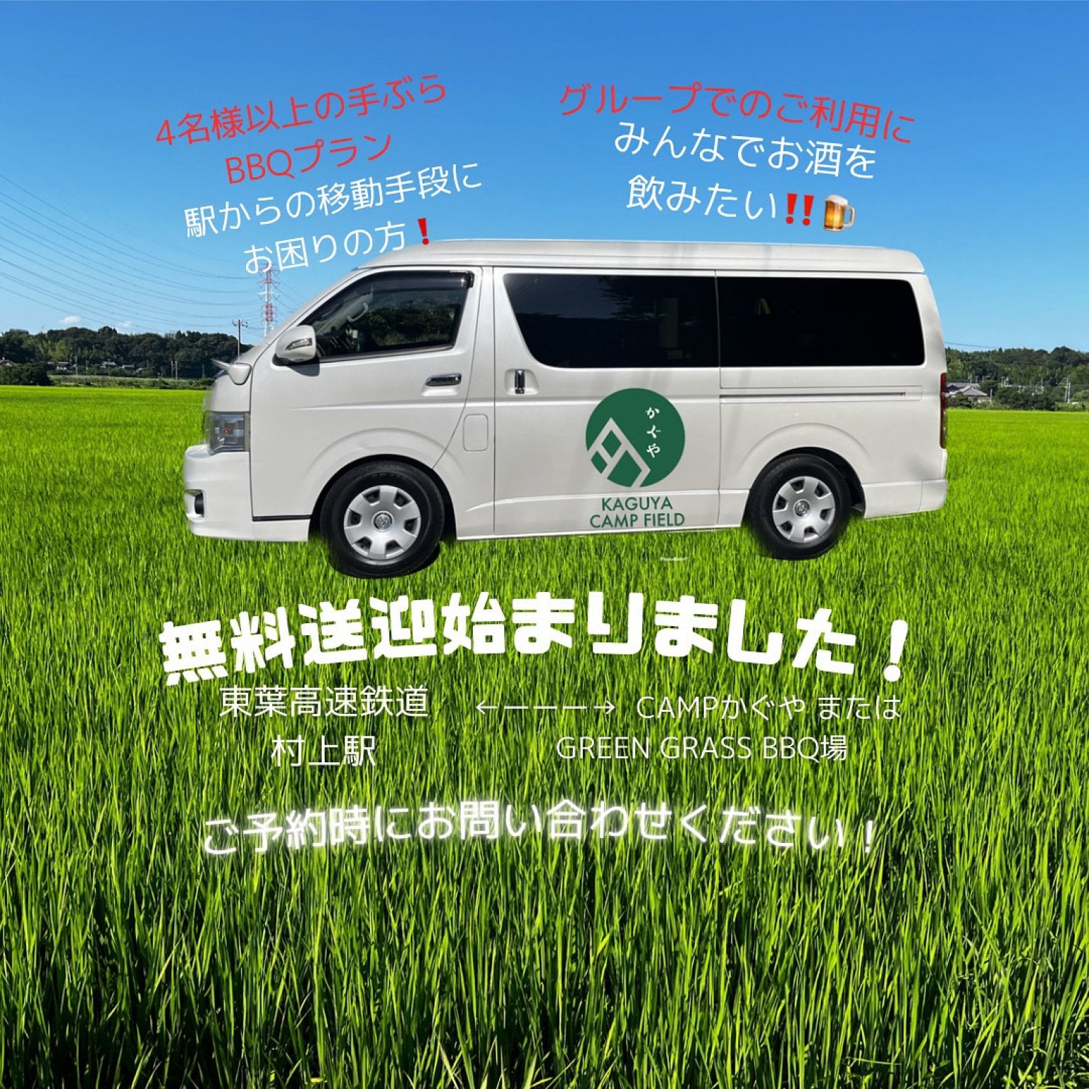・4名様以上の手ぶらBBQプランをご利用のお客様限定で最寄駅(東葉高速鉄道 村上駅)から県立八千代広域公園内BBQ場目の前までの無料送迎を致します。