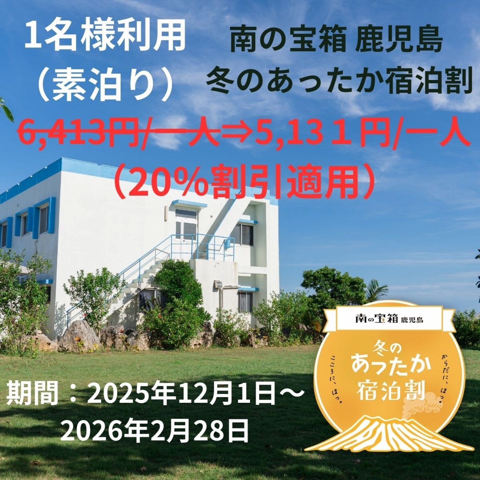 「この商品は、「南の宝箱 鹿児島冬のあったか宿泊割キャンペーン」を活用した旅行割引プランです。」