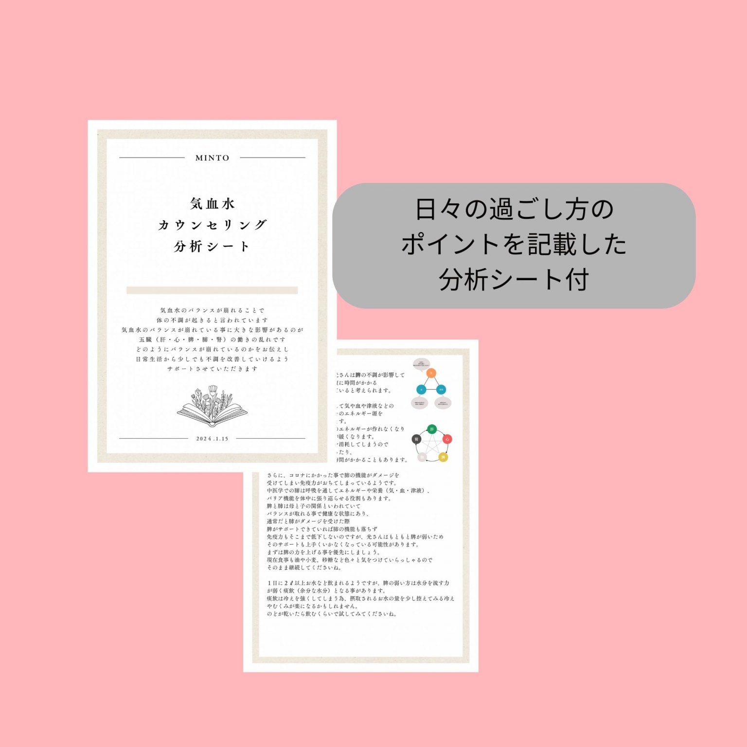 『体質チェックシート』や『カウンセリングシート』を用いて気血水と五臓のバランスがどのように崩れているのかをチェックします。