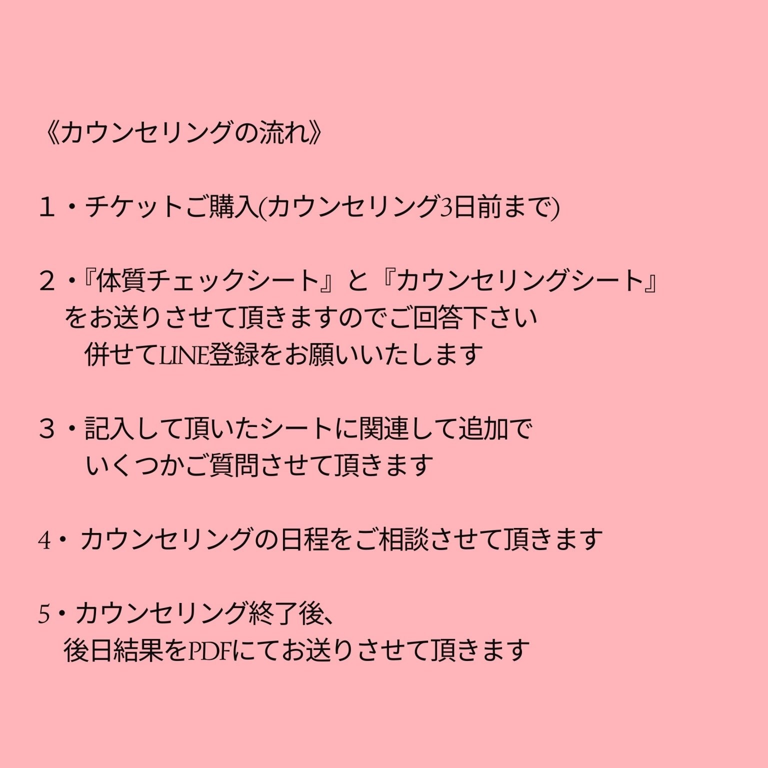 ご自身の状態を知っていただき、不調がない本来の自分を取り戻す為どのような事に気を付けたらよいか、オンライン(カウンセリング40分)でポイントと日々の食事の取り方や過ごし方などをアドバイスさせていただきます。