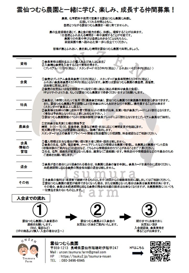 ②会費のお支払いは指定期限までに指定口座に振込(振込手数料は会員の負担)、HPサイトより入金、もしくは雲仙つむら農園まで持参くださいますようお願いします。