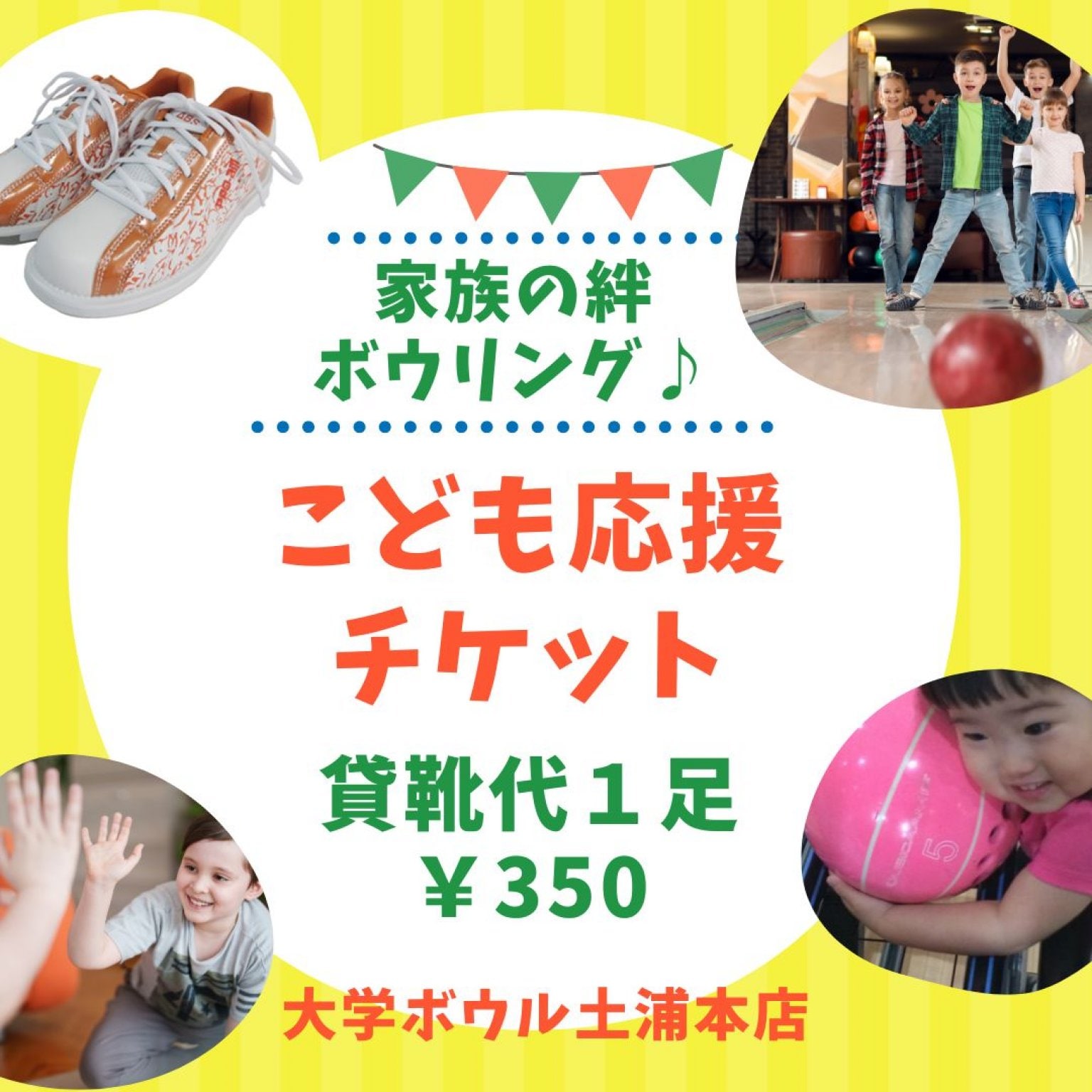 このチケットが少しでもご家族の絆を深めるお手伝いになることを願っております。また、お子様が複数いらっしゃるご家庭が少しでも負担なくボウリングを楽しんでいただきますよう。