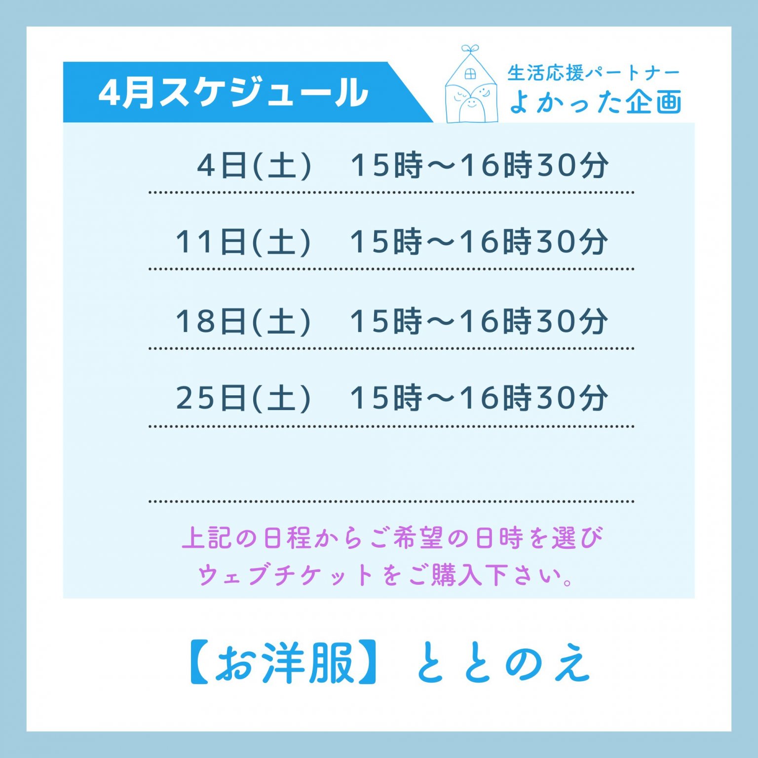 4月の毎週土曜日、15時〜16時30分(90分)の「ととのえ」は、一番身近なパートナー「お洋服」です。