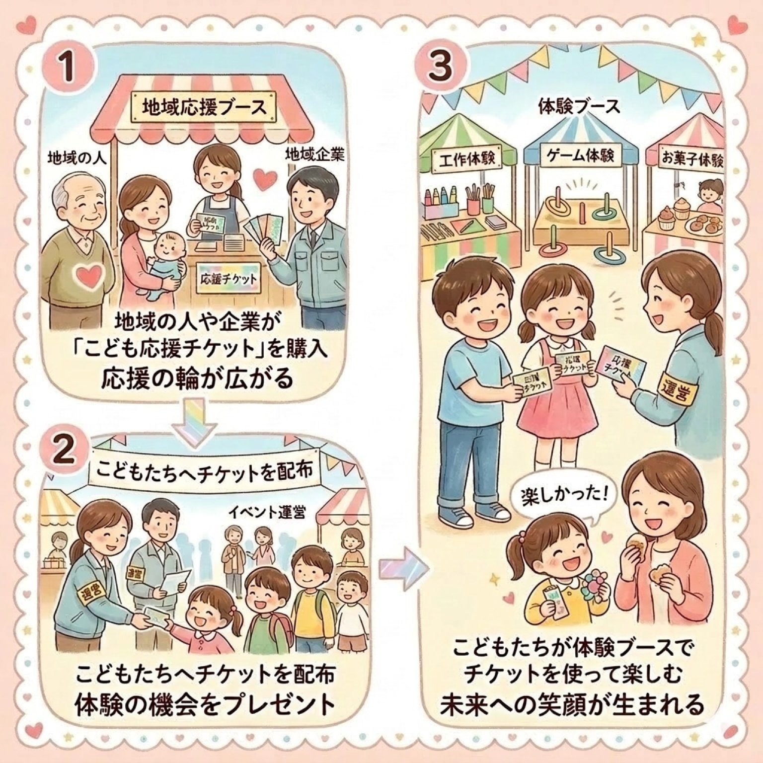 ご購入いただいた応援は、イベント当日に1枚500円の体験チケットとしてこどもたちへ届けられ、会場のワークショップや体験ブースなどで使用されます。