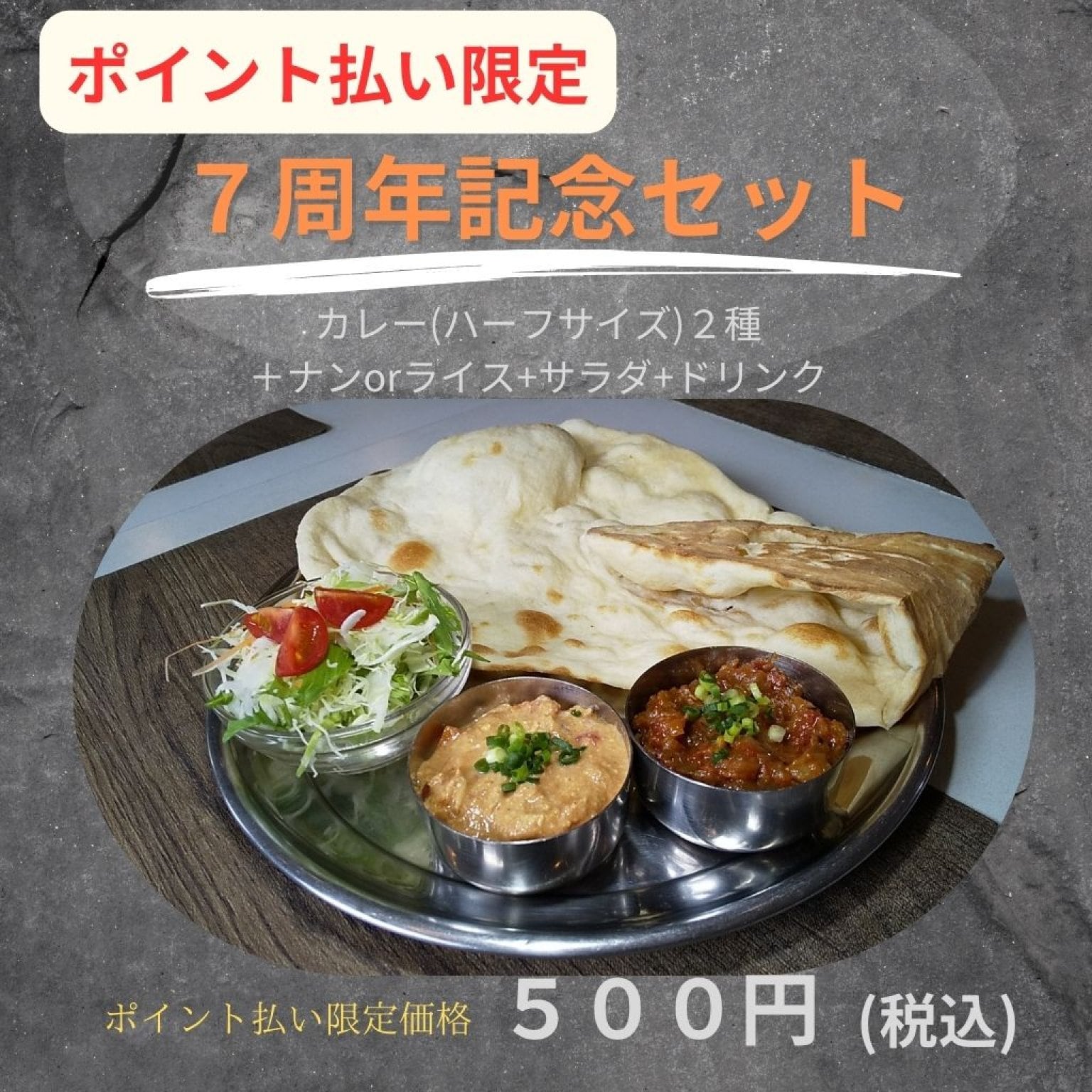 セット内容 カレー(ハーフサイズ)2種 +ナン or ライス + サラダ + ドリンク