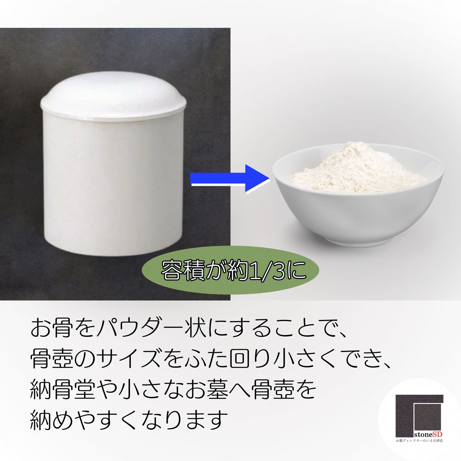 粉状にすることによって、ご遺骨の容積をおよそ3分の1にまで小さくすることができ、納骨所に省スペースでご遺骨を安置することが可能になります。