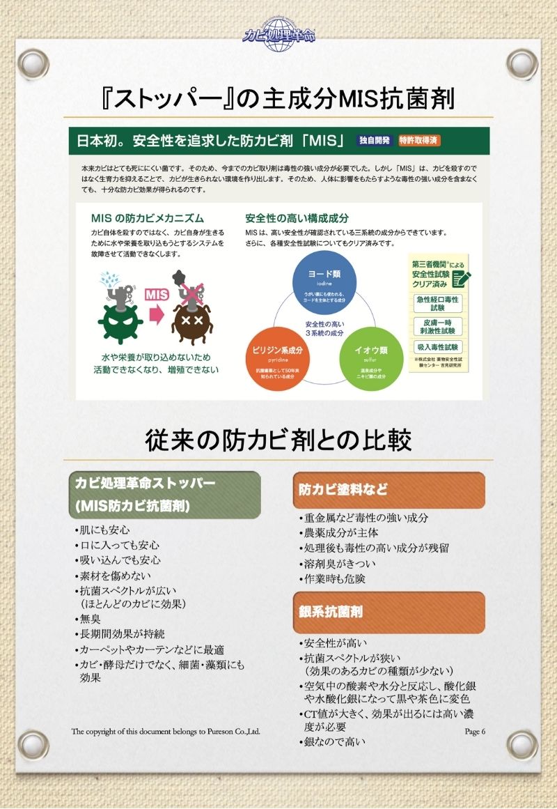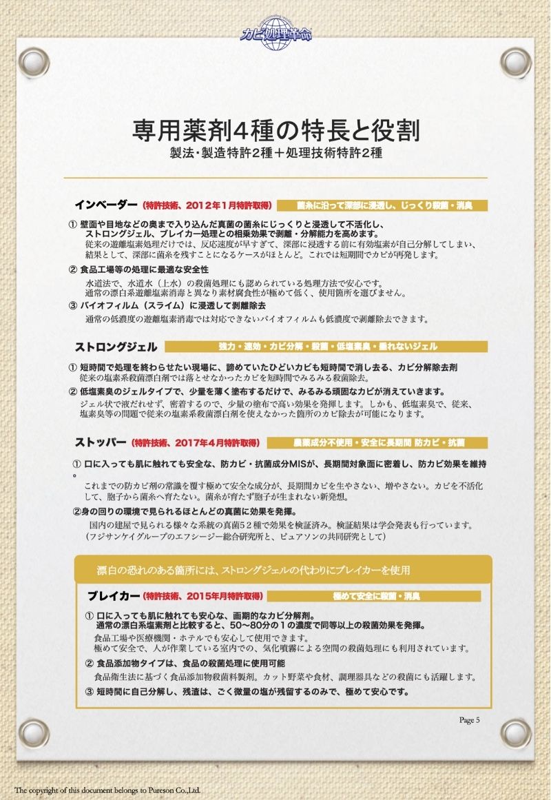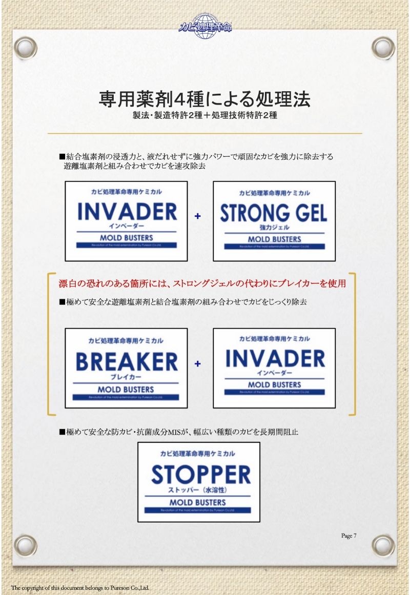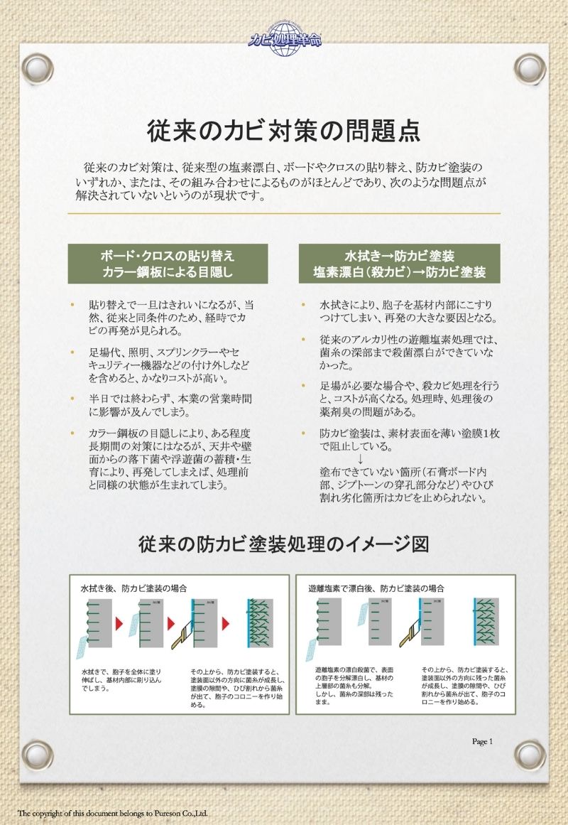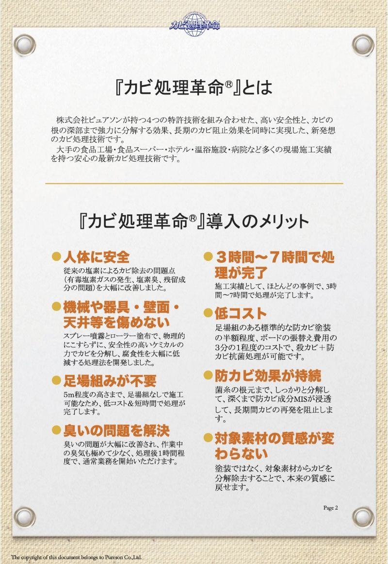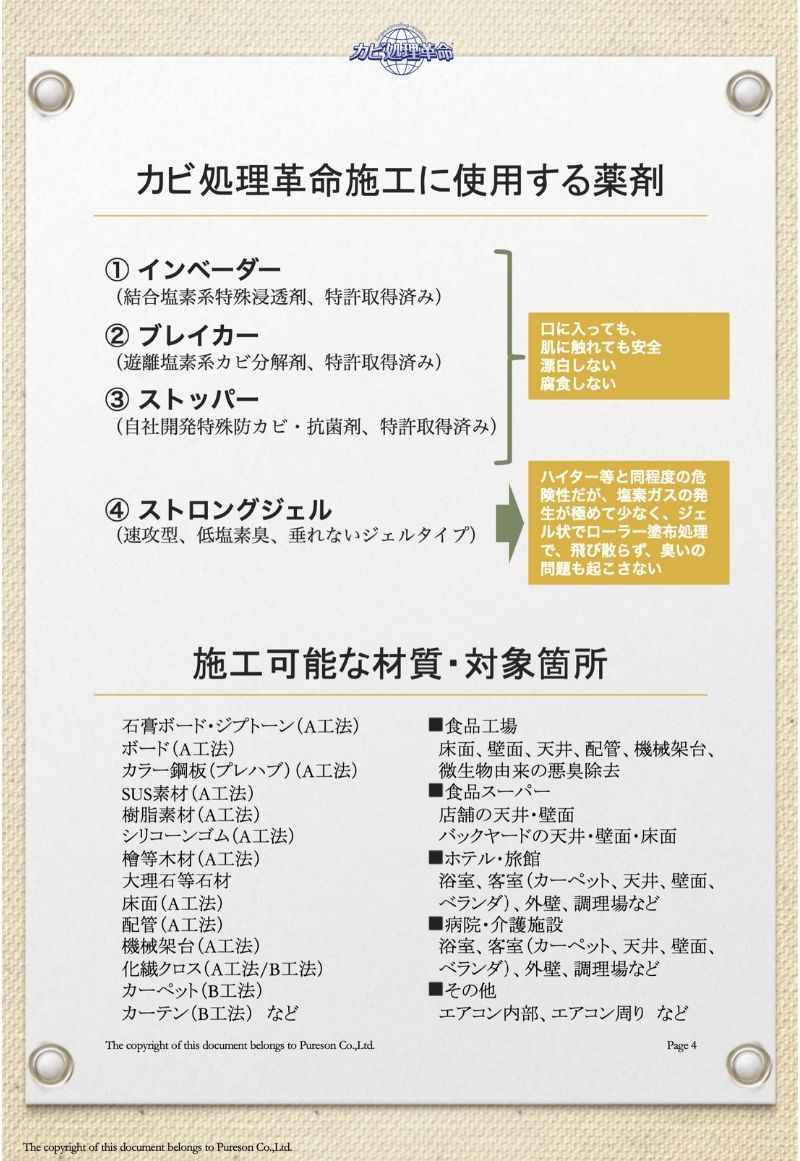 特許技術(カビ処理革命)の施工方法にて、カビを除去したあと、防カビ処理まで行います。価格は1㎡当たりの最低価格です。市販のカビ取り剤と性能が大きく異なり、カビの根まで液剤を浸透させ、死滅させ、不活化の処理を施します。人体に安心安全な液剤を使用していますので、病院や老人福祉施設、学校や幼稚園や保育園、食品加工工場、食品スーパーなどでの施工依頼に対応しています。『カビ』でお困りのことがあれば、是非ご相談下さい。お役に立てると思います。