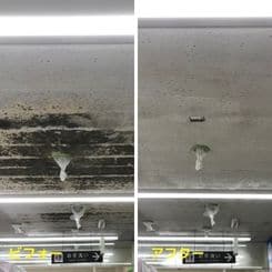 食品スーパー売場天井のカビ処理です。特許済の特殊液剤にて、カビの根まで浸透除去し、カビの発生しにくい環境に!