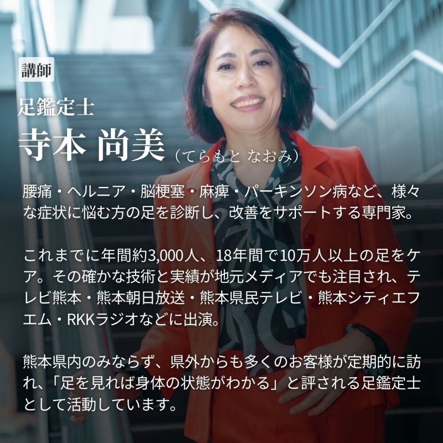 火の国熊本に店を構え、18年間で10万人の足を施術。腰痛・ヘルニア・脳梗塞・麻痺・パーキンソン病など、様々な不調を改善してきた足のプロフェッショナル。