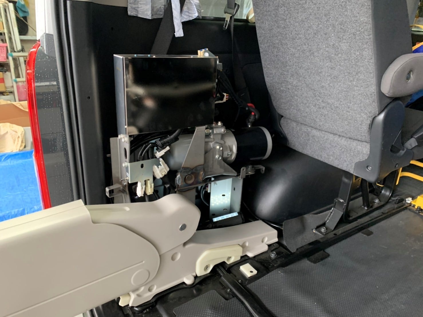 助手席側最後部の内装を外すと昇降リフトの心臓部分が見えます。
