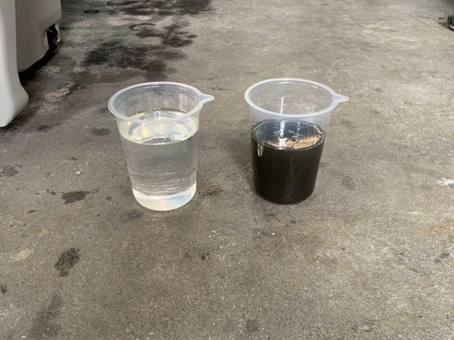 左が新品の作動油、右が抜いた作動油。