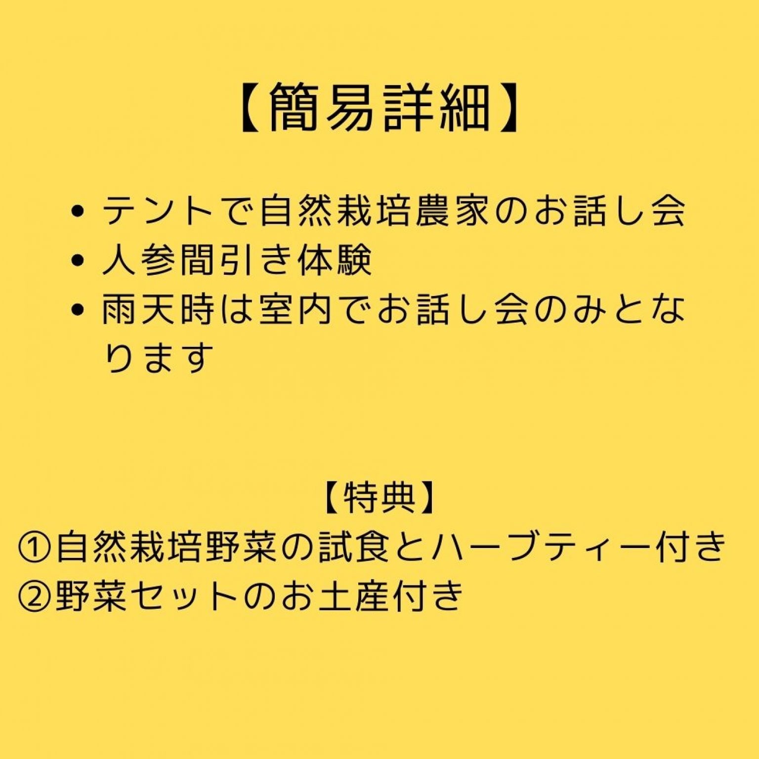 その畑のなかで、人参の間引き体験で実際に土に触れ、農を体験したあとは、畑のテントで温かい無農薬ハーブティーを飲みながら、自然栽培農家のお話を聞きましょう!