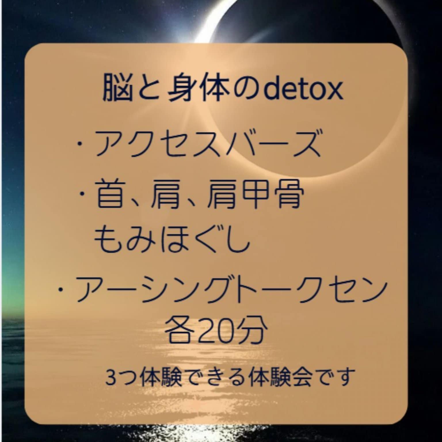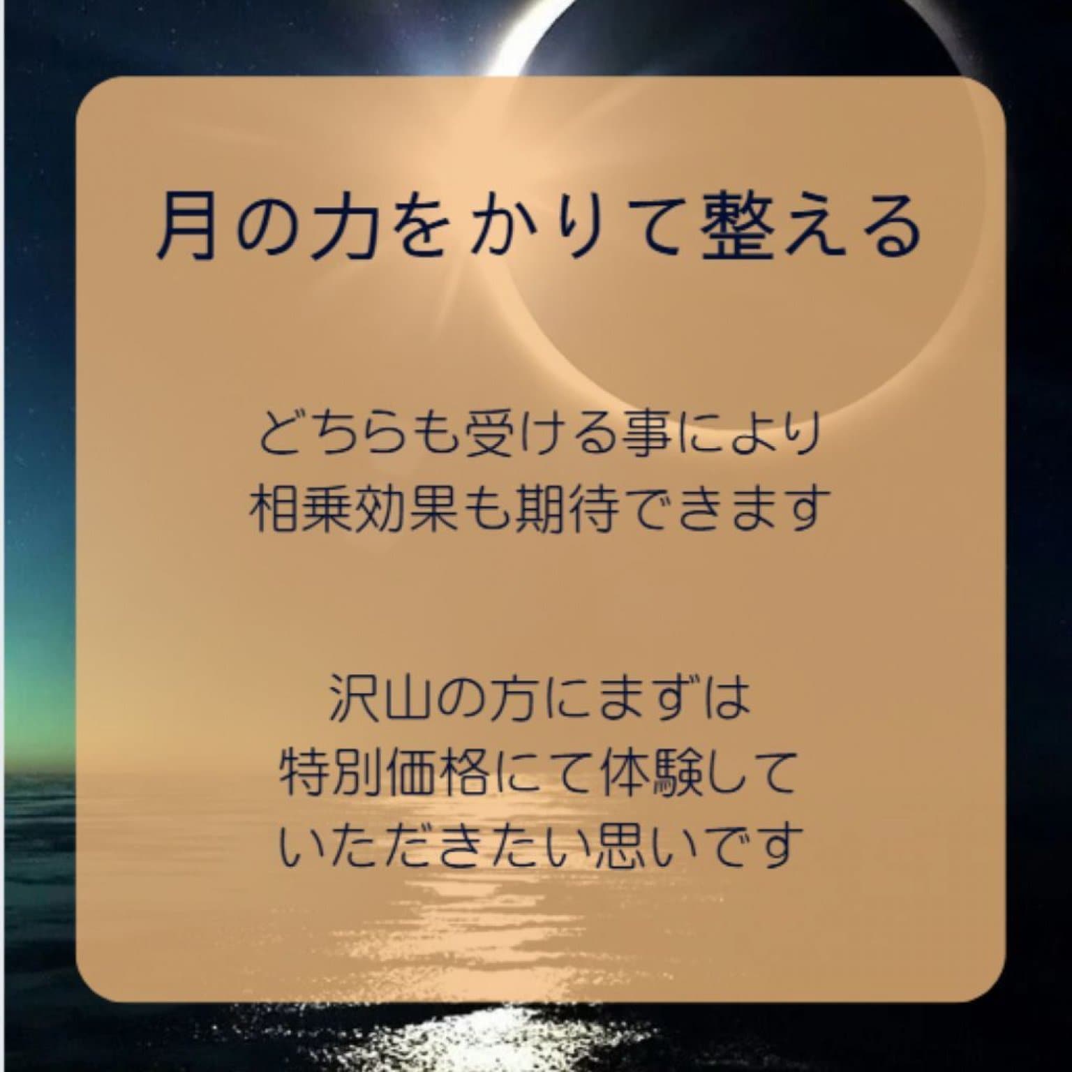 アクセスバーズ、もみほぐし(首、肩、肩甲骨)、アーシングトークセンを各20分、一度ですべて体験出来るイベントです。満月や新月ならではの月の力をかりて、心も体も癒しデトックスができます。