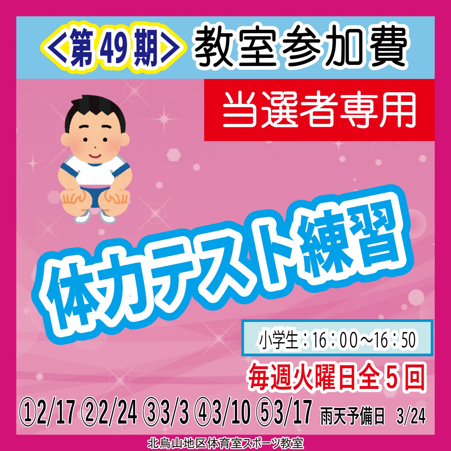 教室に関する詳細なご説明、諸注意事項に関しては、 https://kitakarasuyama-sp.jp/lesson-season49/ (北烏山体育室ホームページ)にございます「北烏山スポーツ教室参加について」をご覧ください。