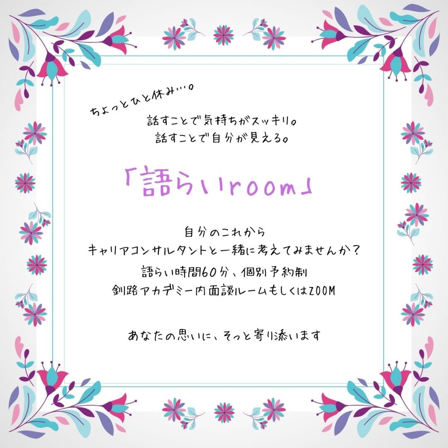 語らいroom、個別相談、年齢制限なし、随時受付、受付後メールにて利用日決定、