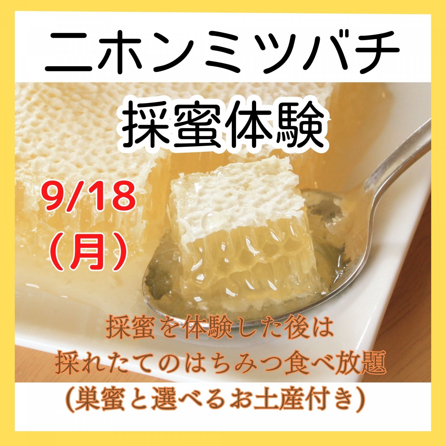 9月18日(月)ニホンミツバチ 採蜜体験(1日10人限定)巣蜜と選べるお土産付き【店頭払い専用】