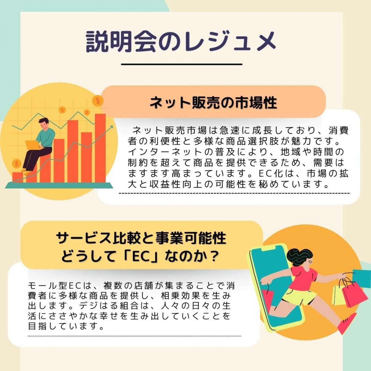 EC化支援事業説明会を開催します!説明会の内容は、「1ネット通販の市場性、2サービス比較と事業可能性、3デジはる組合の活用事例、4おすそ分け概念で共創できる世界」の4つのコンテンツを説明します。2部構成としますので、出席を希望する部を選択してください。