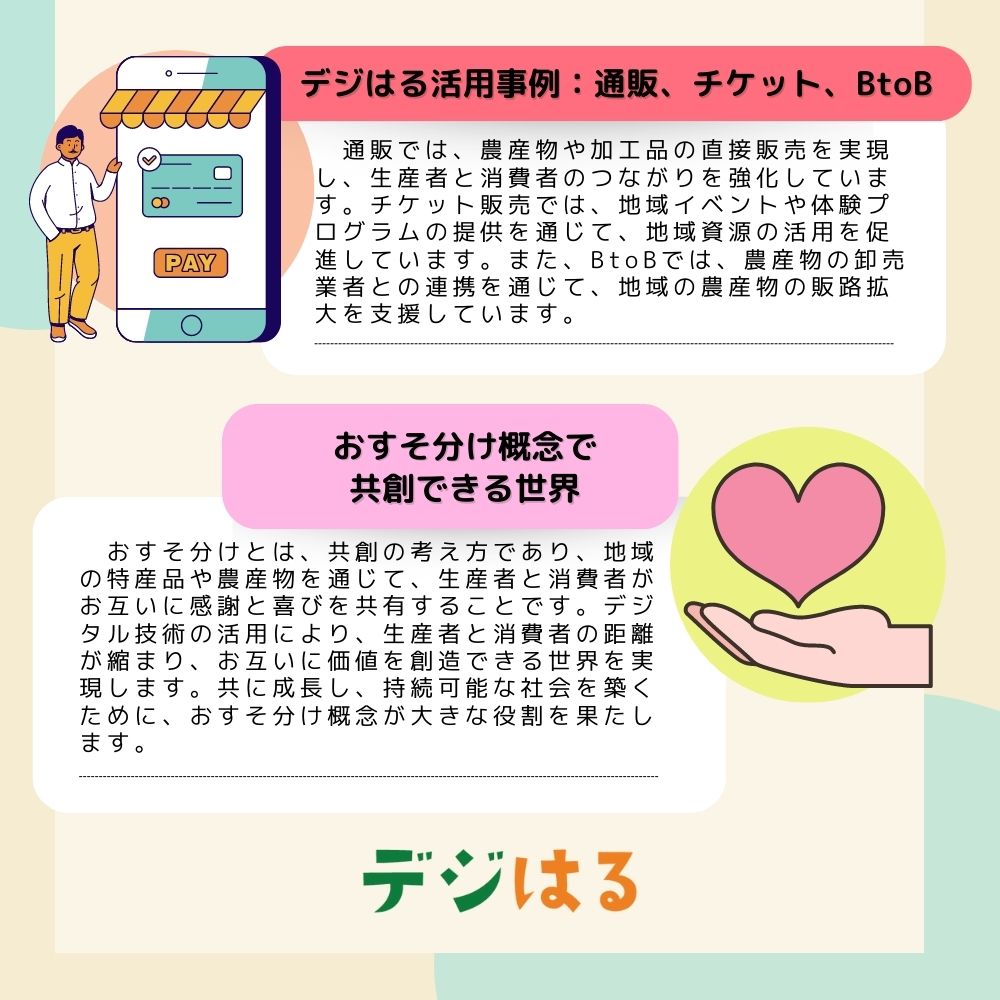 簡易詳細:当日は、「1ネット通販の市場性、2サービス比較と事業可能性、3デジはる組合の活用事例、4おすそ分け概念で共創できる世界」の4つのコンテンツを説明します。