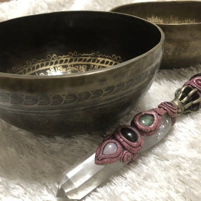 その後、ヒーリングスティックで一番弱っているチャクラから、ネガティブな物を放出し、宇宙のエネルギーで満たします。最後は、またシンギングボウルにより、エネルギーを整える。