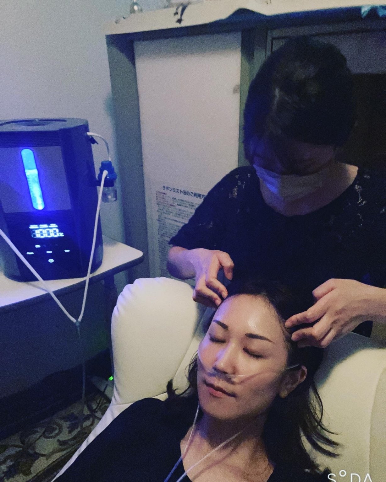 リクライニングソファに座っていただき、鼻からカニューラをいれ水素ガス吸入をします。そのままリクライニングソファを後ろに倒し、ヘッドマッサージをしていきます。頭、目、顔周り、首、肩甲骨などをほぐしていきます。お部屋は完全個室。照明も薄暗く、ゆったり、リラックスして睡眠もとれます。