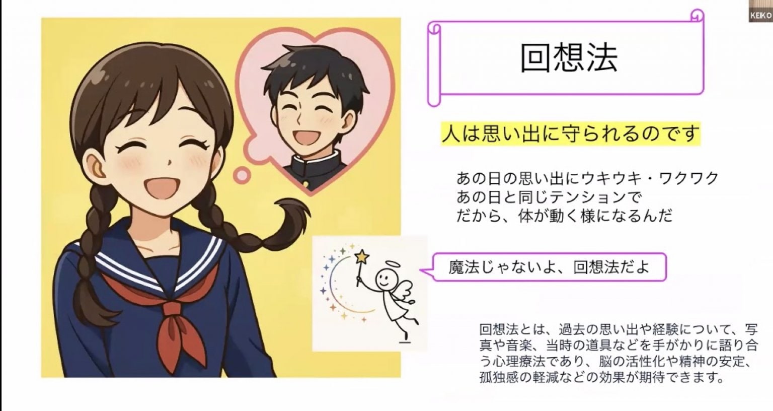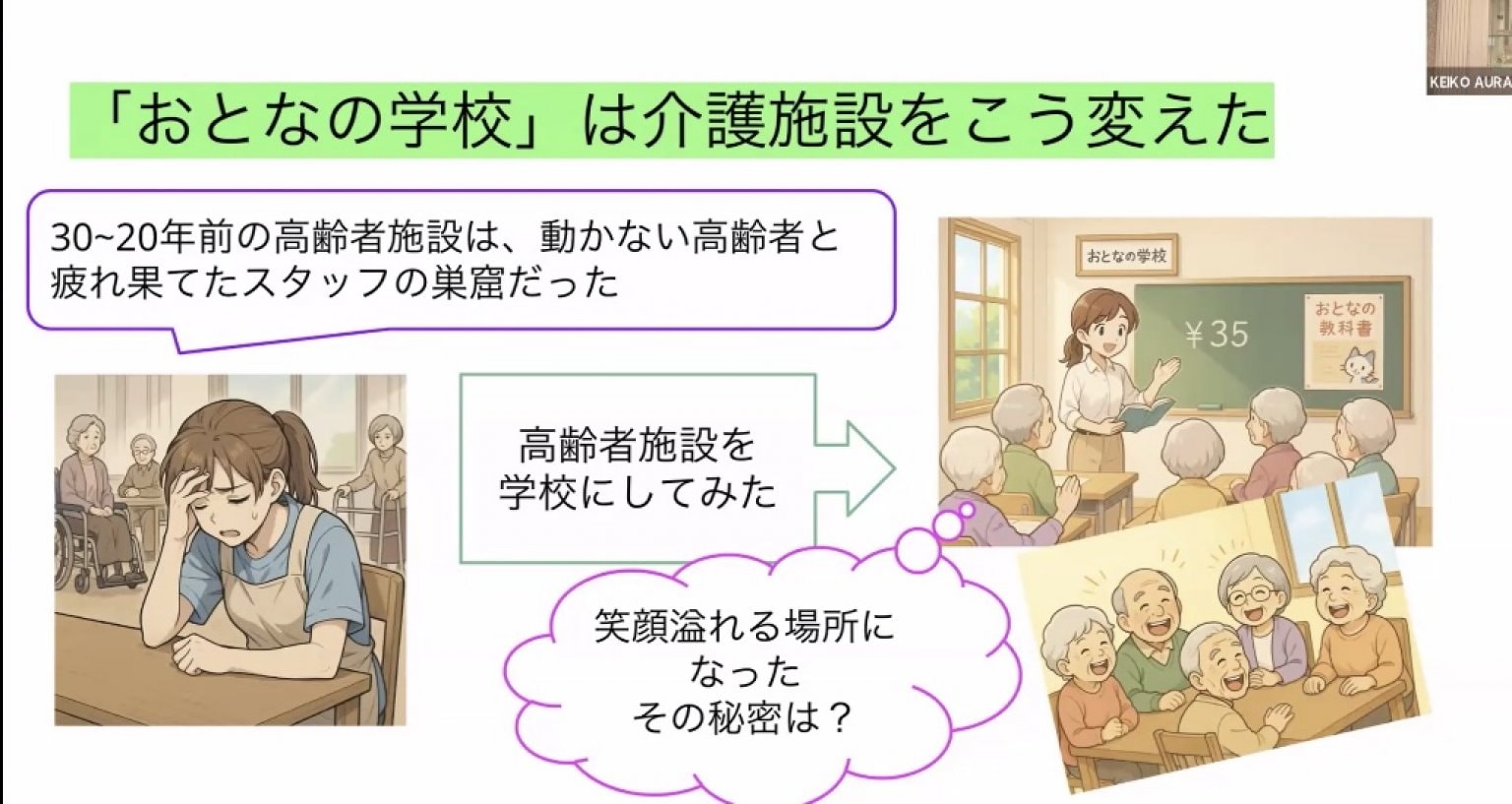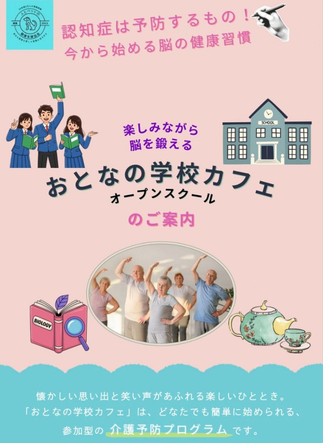 「生徒だった『あの日』に帰っていただき、いろいろなことを思い出せば、脳が活性化されていきます。(対話が脳を活性化することは科学的にも根拠があり、介護予防にも効果があるとされています。)