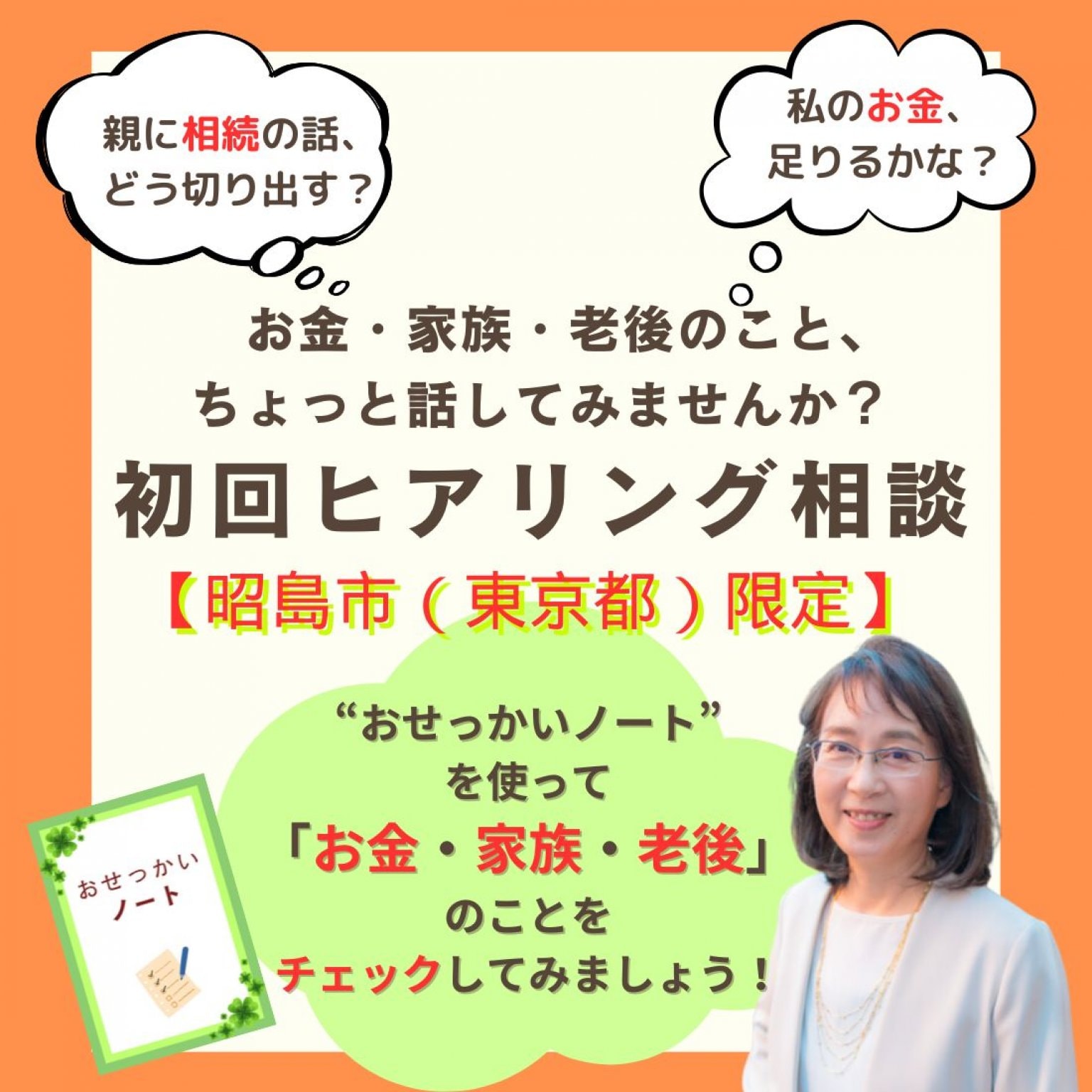 Zoomでのご相談も可能です。いずれの方法でも「おせっかいノート」を使ってじっくりお話を伺います。