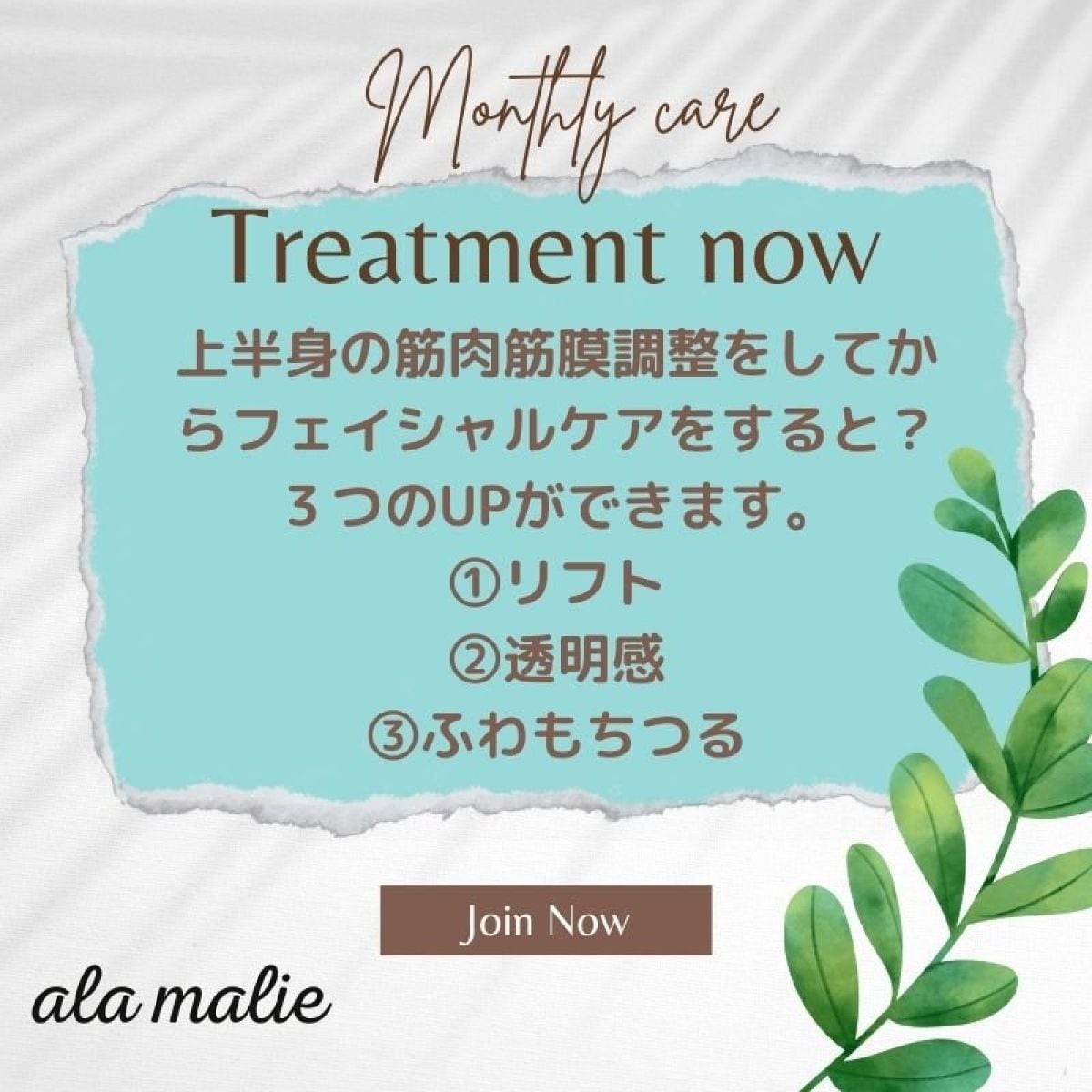 モニター特典:①モニター施術終了後、定期的ケアをご希望の方は継続価格にてご提供致します。