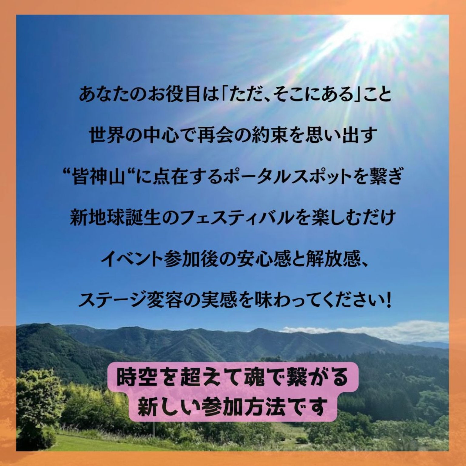 内容:魂の仲間と集い未来への約束を交わす「REUNION」=再会イベントです。参加者の潜在コード&創造主性を活性する共同ワークも行います。