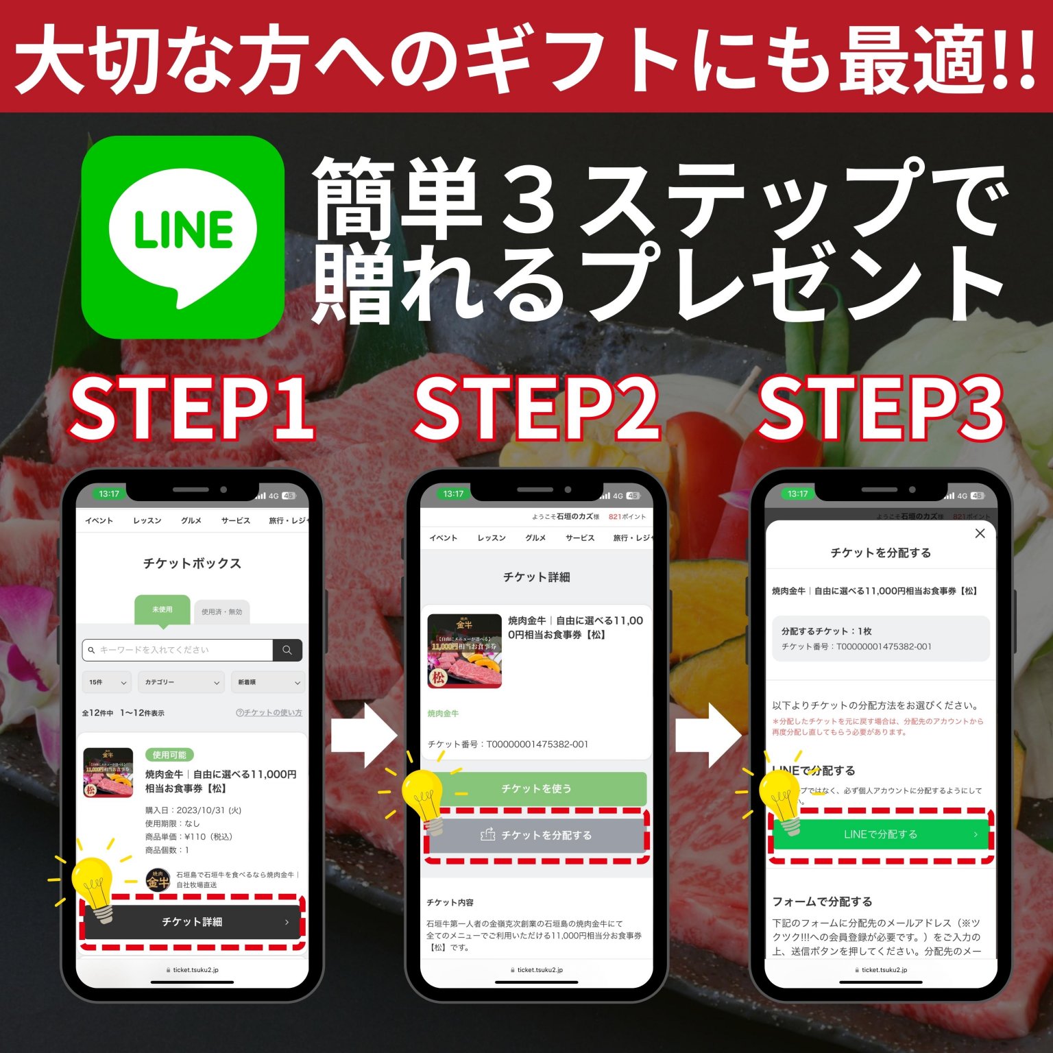 →「チケットを分配する」からLINEやメール送信できます