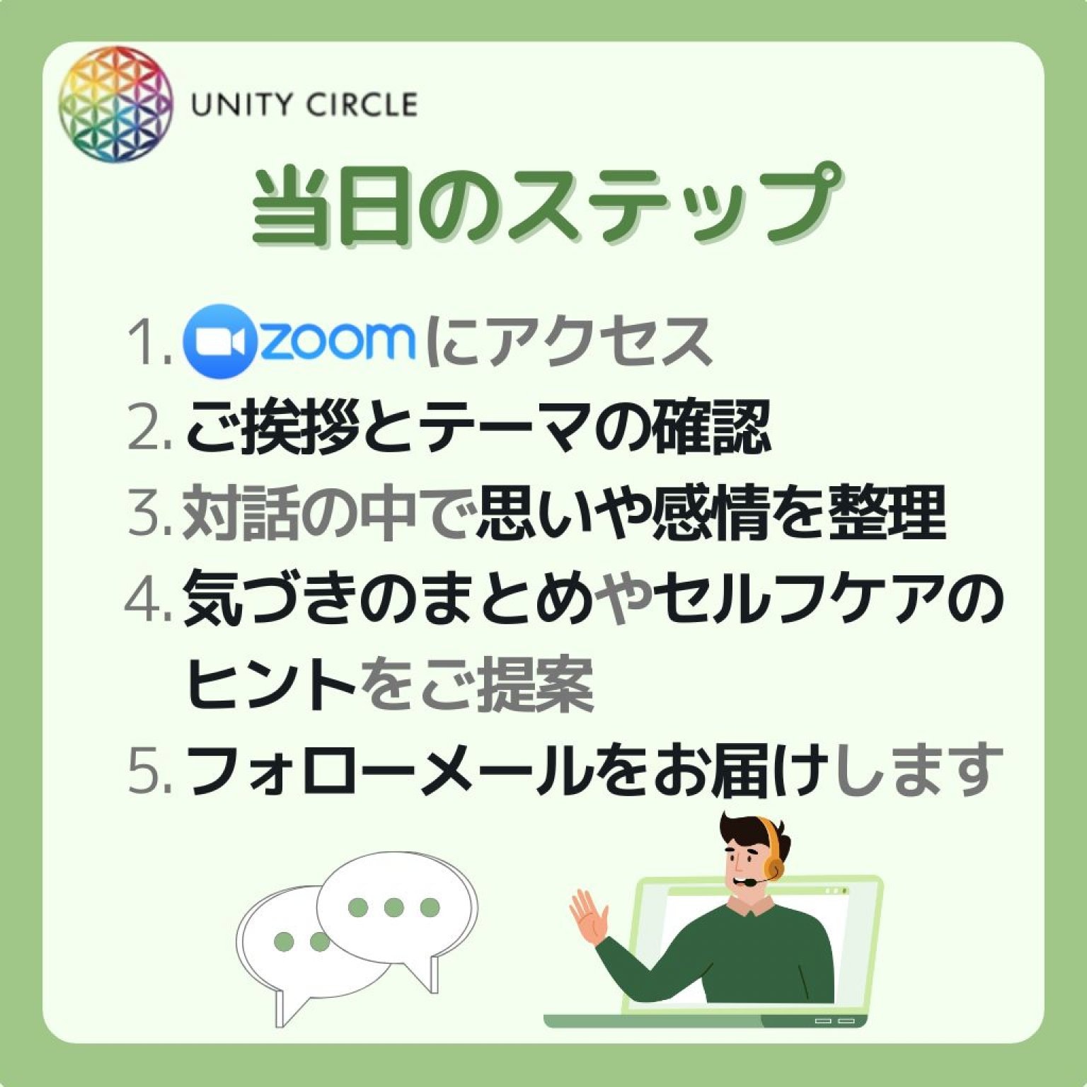 ビデオ通話(または音声のみも可)で行います。リラックスできる空間でご参加ください。