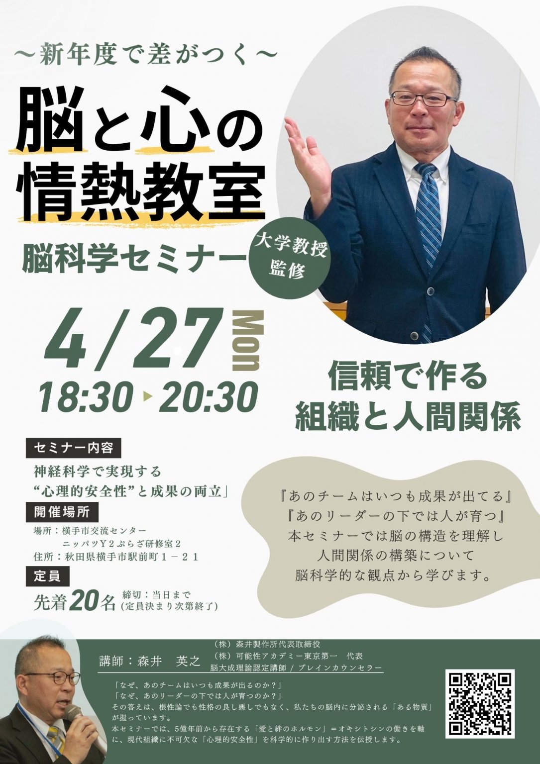 本セミナーでは、5億年前から存在する「愛と絆のホルモン」=オキシトシンの働きを軸に、現代組織に不可欠な「心理的安全性」を科学的に作り出す方法を伝授します。