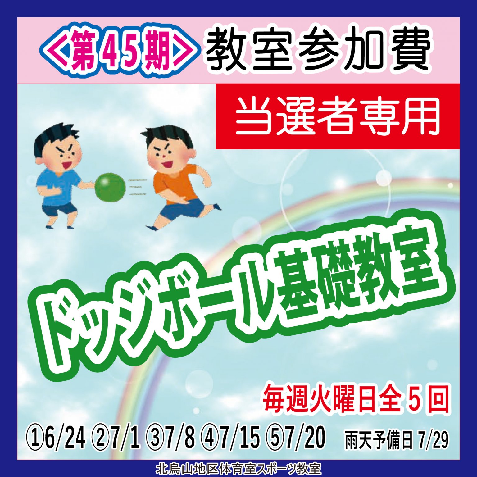 教室に関する詳細なご説明、諸注意事項に関しては、 https://kitakarasuyama-sp.jp/lesson-season45/ (北烏山体育室ホームページ)にございます「北烏山スポーツ教室参加について」をご覧ください。