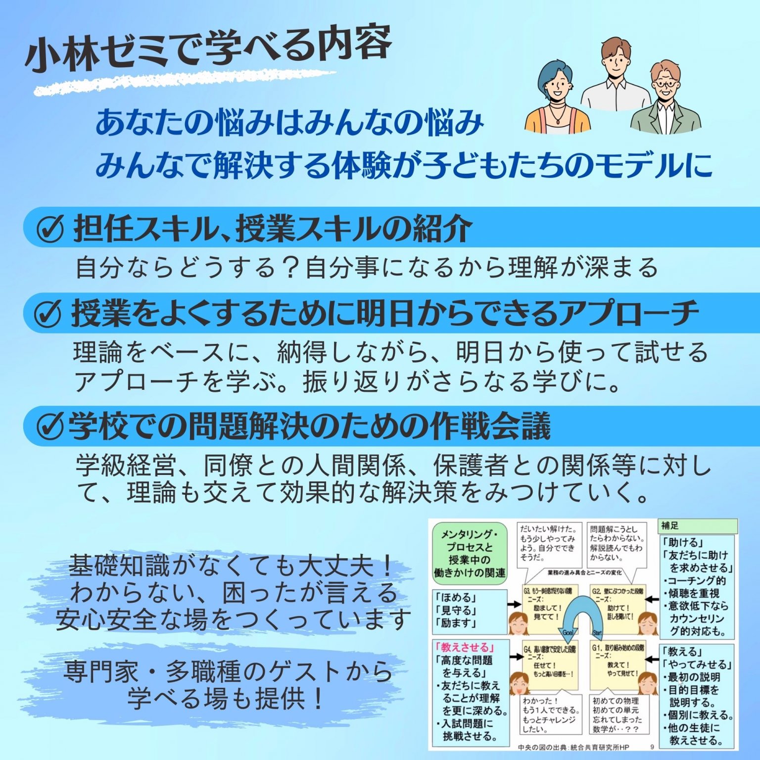 授業改善コンサルタントとして、全国各地の教育委員会や学校のコンサルを行っている小林昭文が、25年の授業実践と、33年の授業研究をもとに開発した「授業の基本スキルとパターン理論」を元に、知見を惜しみなく提供し、ゼミの皆さんの自発的な学びを促進する研究会です。