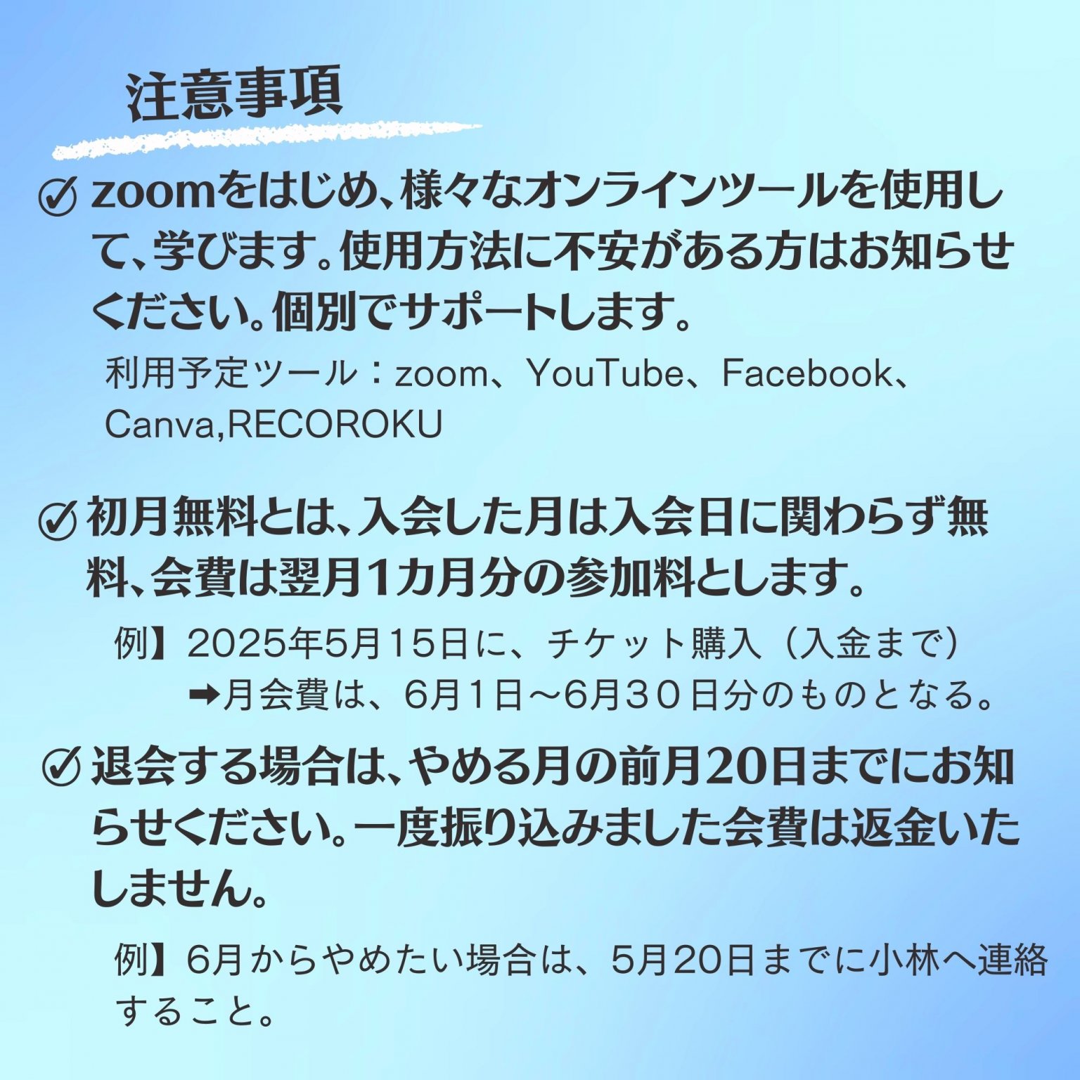 ・退会する場合は、退会したい月の前月20日までに小林へお知らせください。例えば、6月退会したい場合は、5月20日までにご連絡ください。