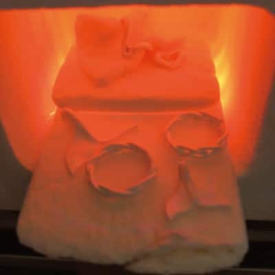 ご家庭のガスコンロや電気炉で焼きます。焼き始めると、バインダーが燃えてなくなり、微粉末同士がくっつきはじめます。