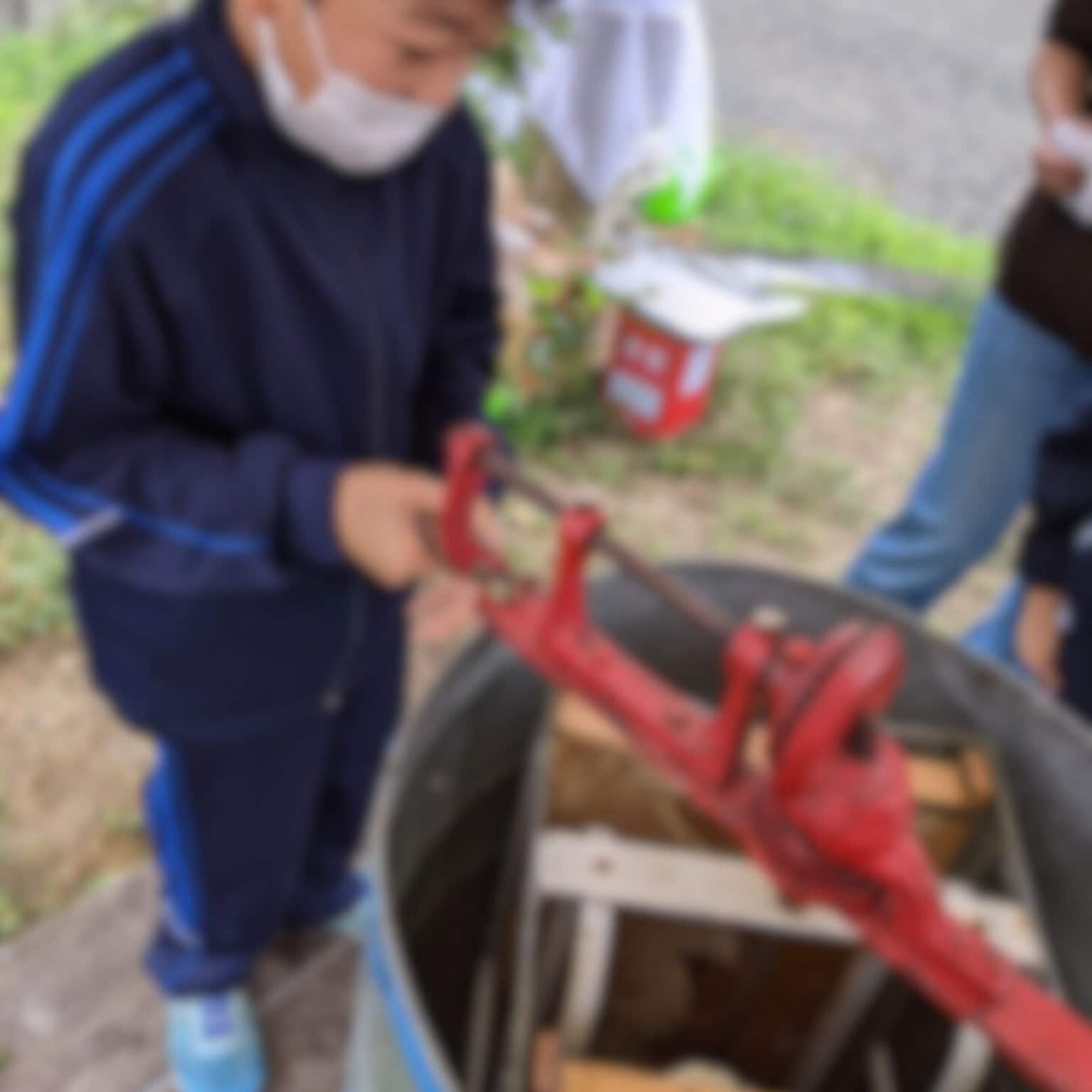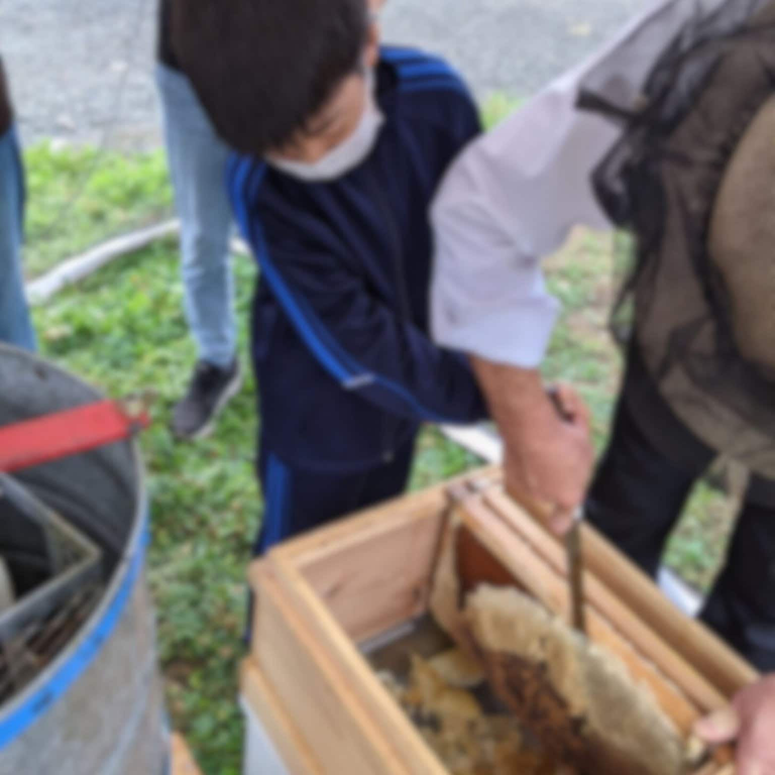 5、ハチ箱からスタッフが巣を取り出しますので、蜜ふた切り・蜜搾りをご体験下さい。