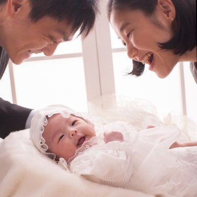 自宅から近く、ベビードレスをレンタルして撮影しました。子供の笑顔を引き出すのが上手で楽しい思い出になりました。 = 文京区 西山様 =