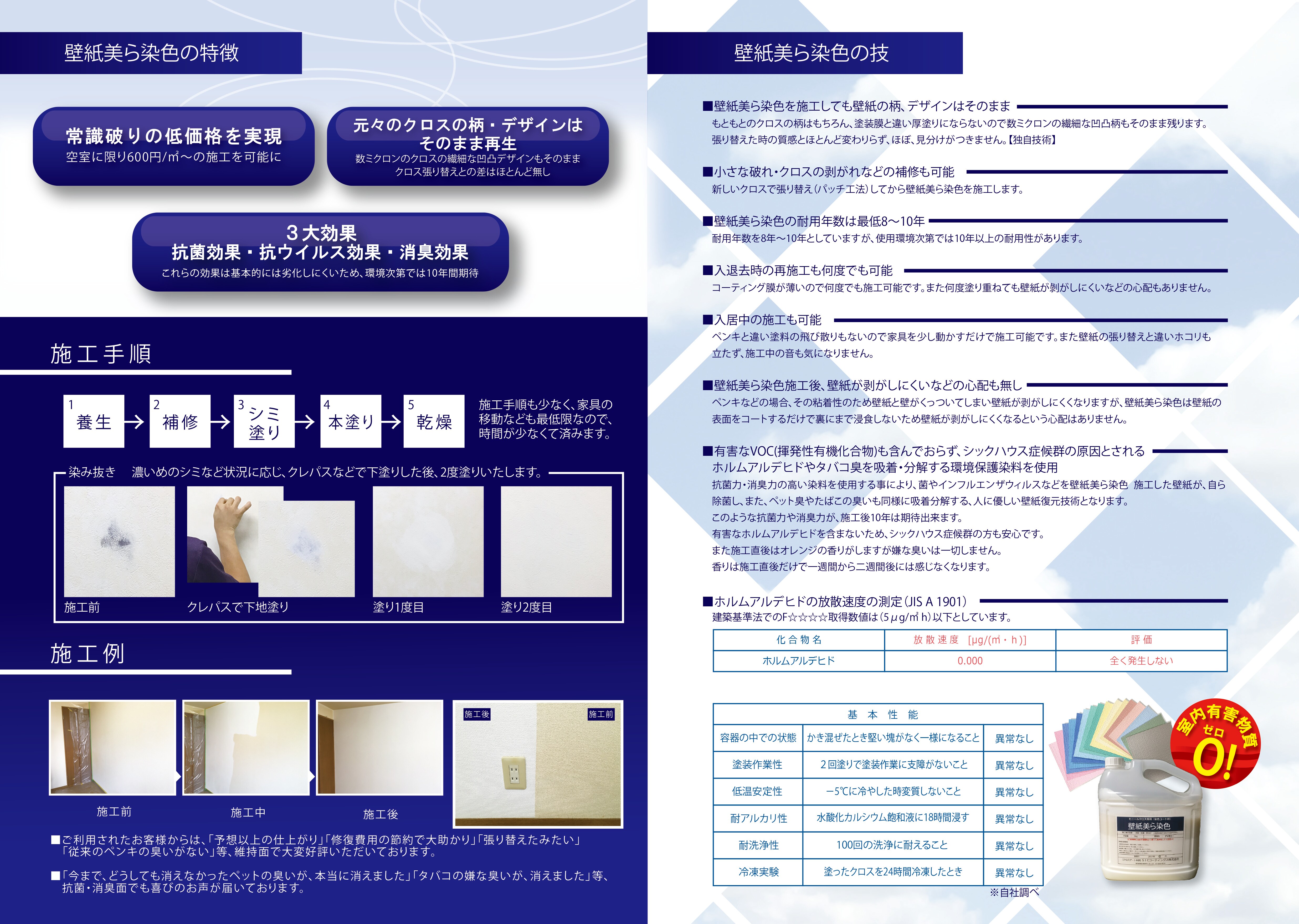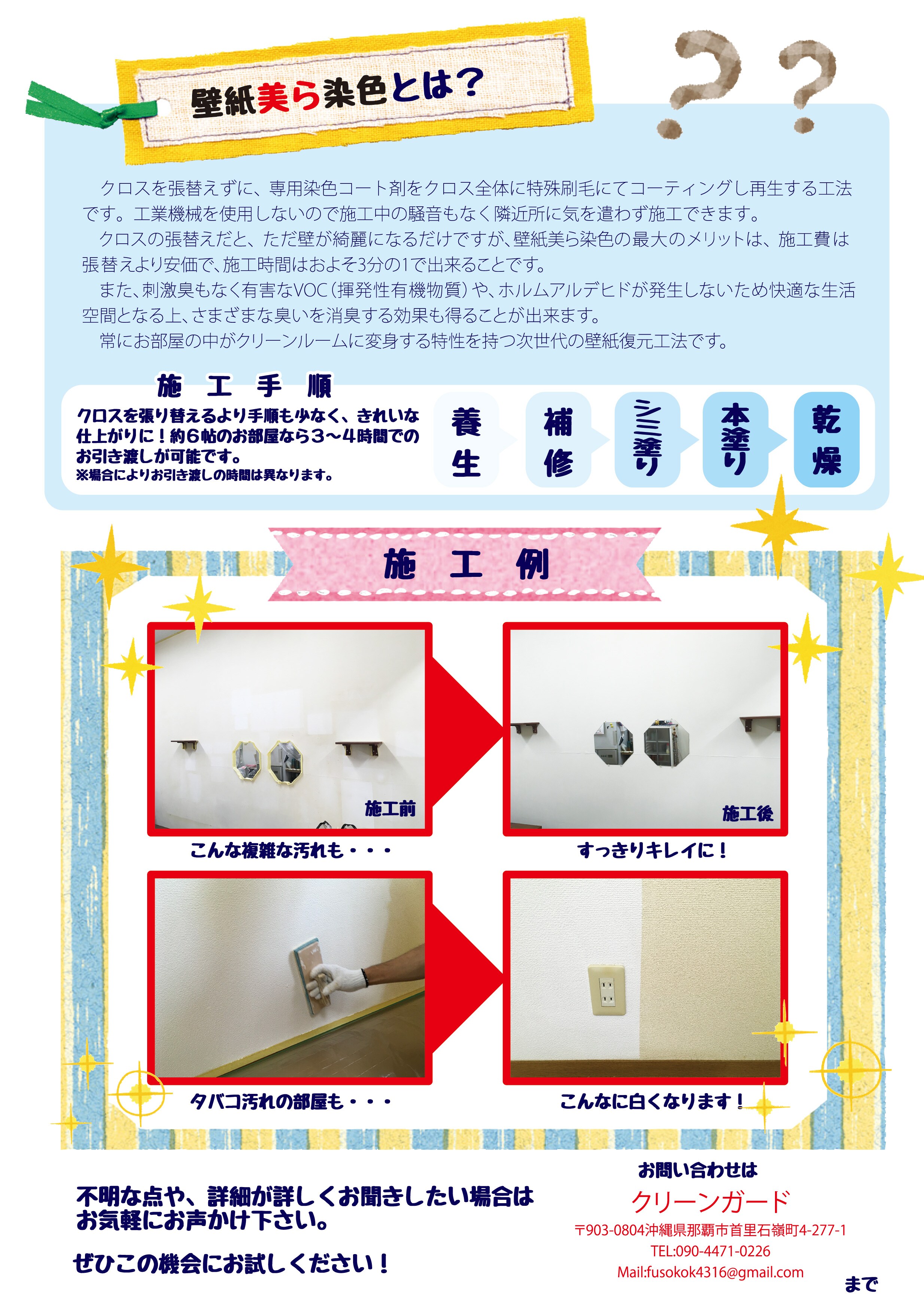 ※汚れのかなりひどい場合は施工不可の場合があります。その際は、“クロス(壁紙)貼替え”をお勧めいたします。弊社でも施工可能です。