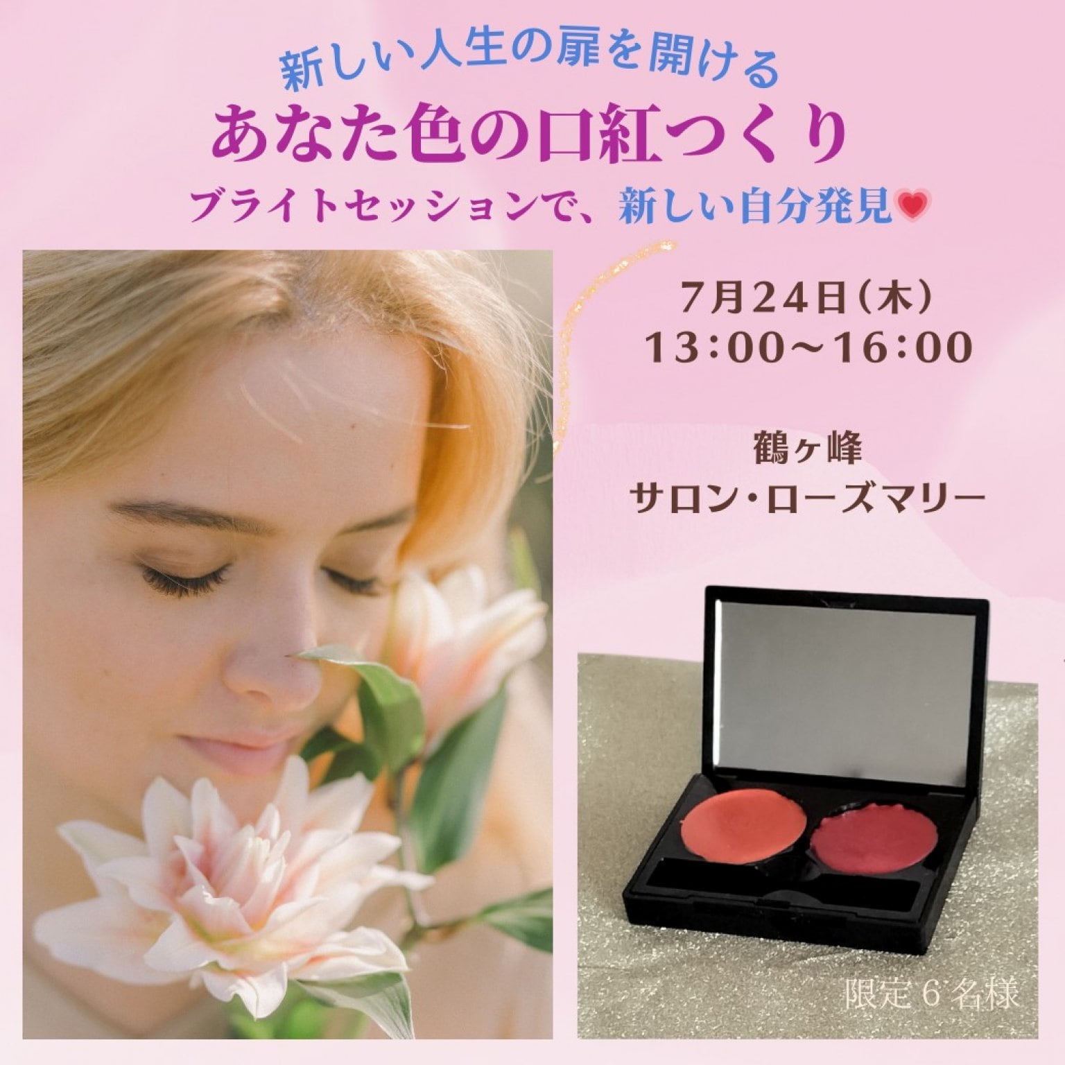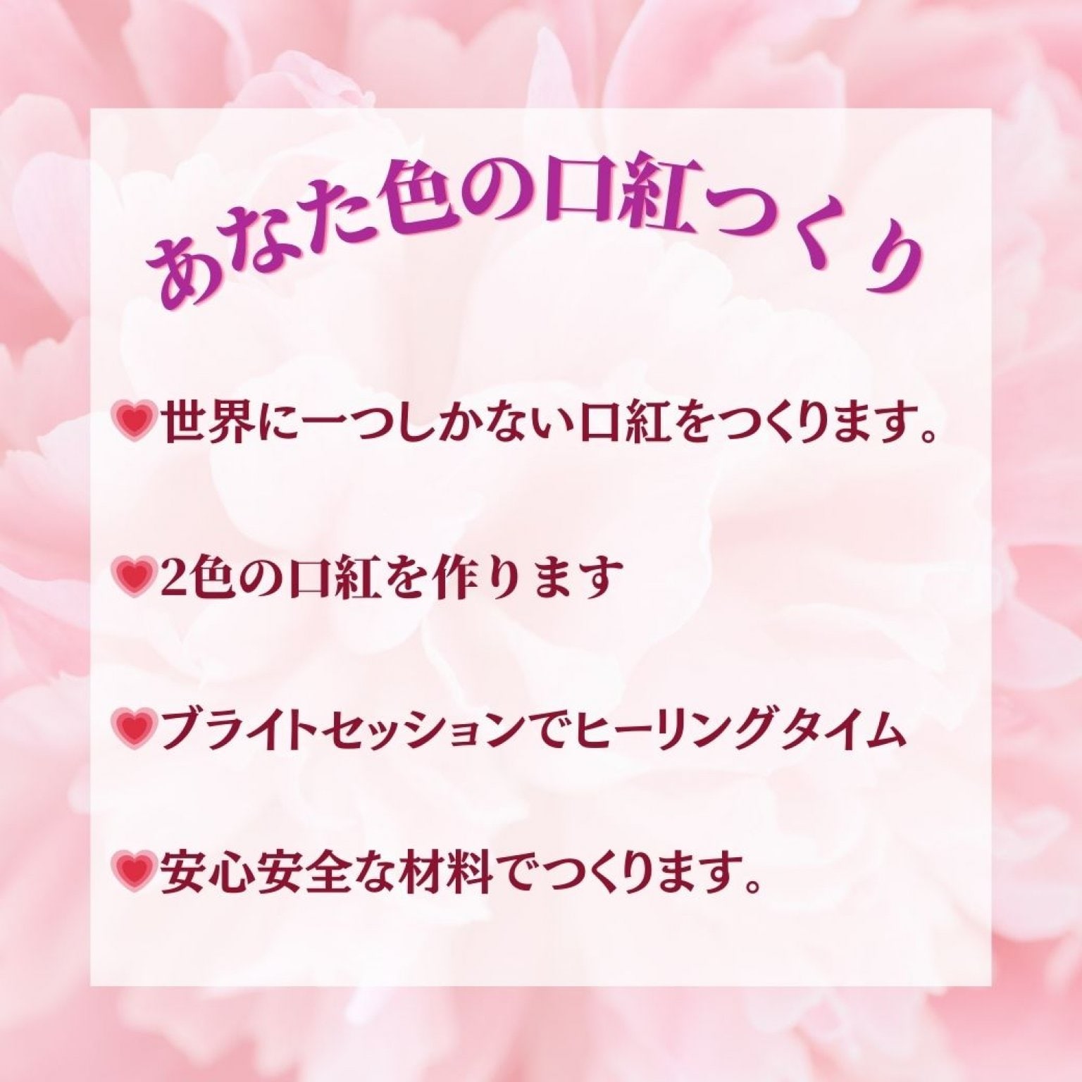 ★中学生以下のお子さんも参加される場合 セッションを受けられる時は3000円 口紅を作られるときは4000円いただきます。