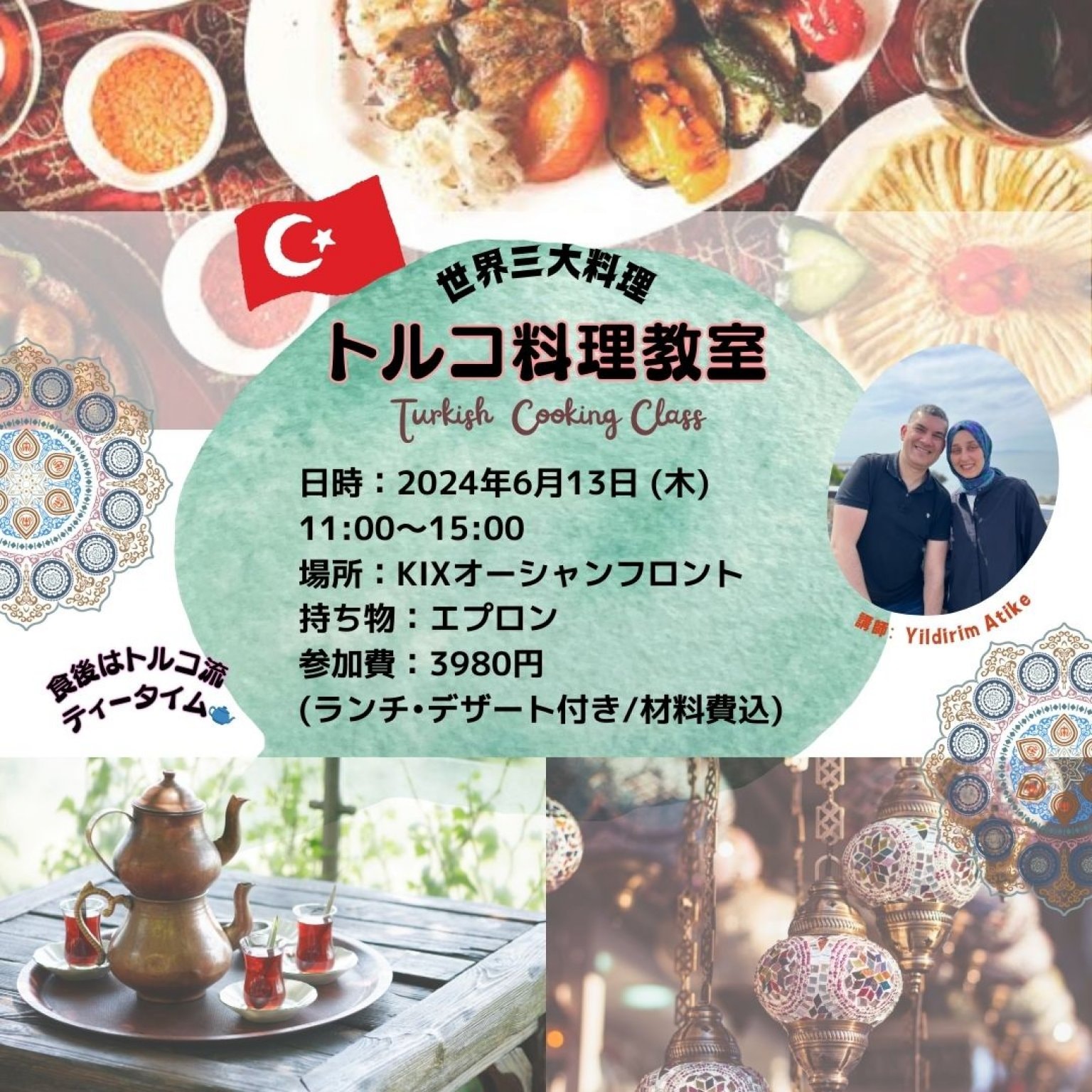 トルコ出身のアティケさんが講師として、家庭の味を丁寧に教えてくれます♪なかなか日本では習うことのできないトルコ料理をこの機会にぜひ!みんなで楽しく話しながらトルコの文化に触れ、美味しいトルコ料理を作って食べましょう!ランチ後はトルコ流のティータイム付き♪