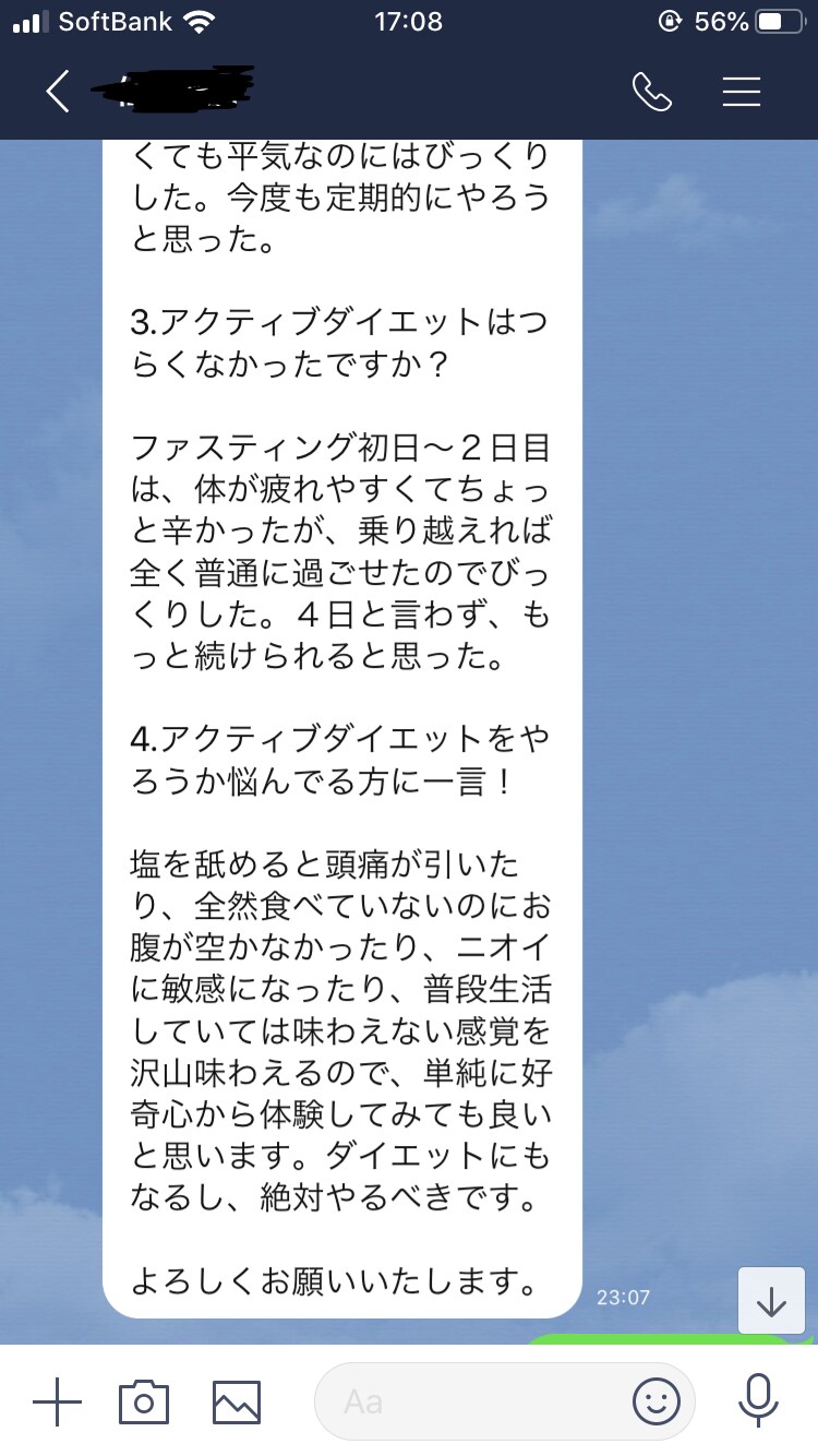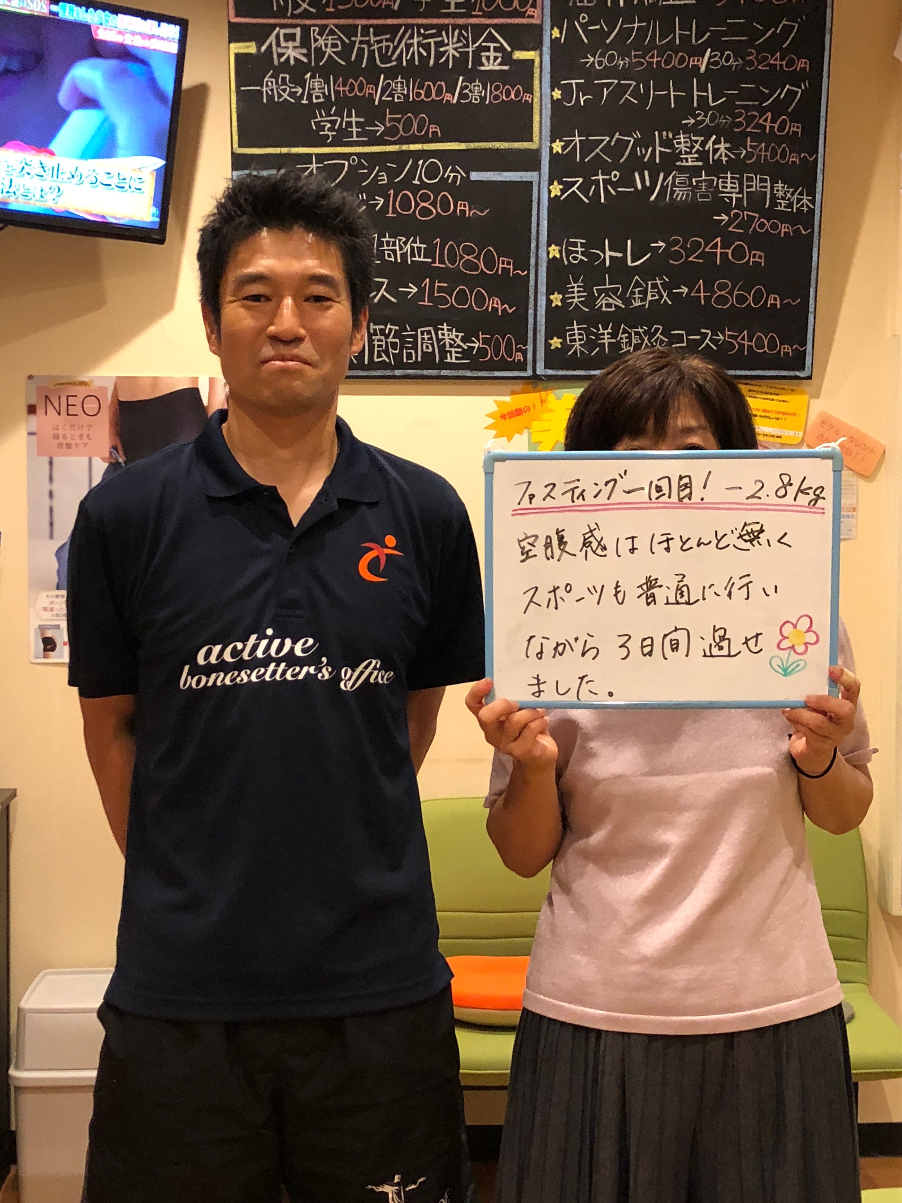 そんな時に当院のアクティブダイエットに出会ってまずは1回やっていただき、3日間のファスティングで、、、