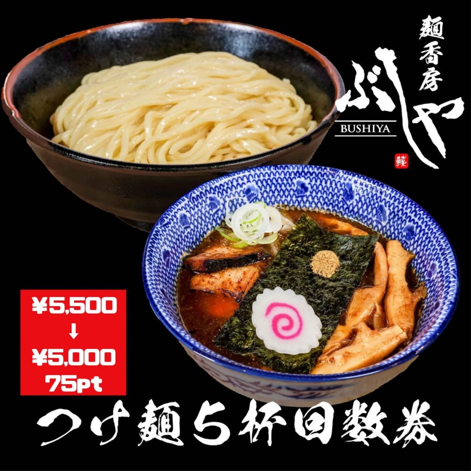 麺香房ぶしや喜多町本店、ながおか花火館店、堺東店にて、こちらのウェブチケットをご利用しお支払いすると、ウェブチケット分のポイントがお客様に付与されます。