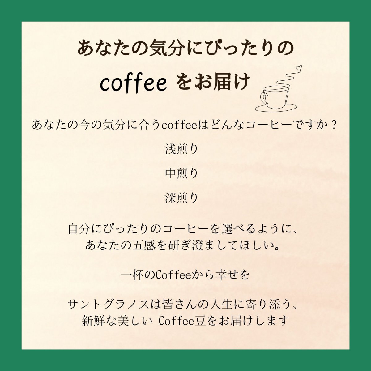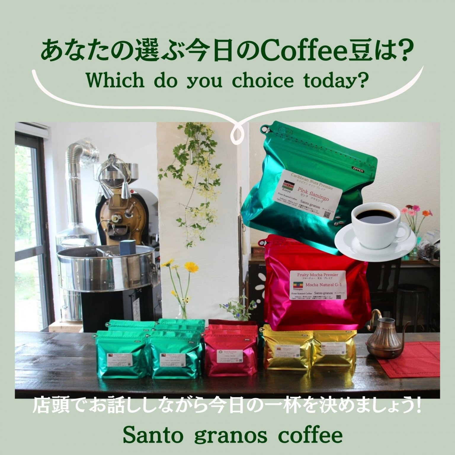 自分自身を整えること、生活を整えること、1杯のCoffeeの持つ力をCoffeeを通して発信してまいります。Santo granosがお届けするのは、そんな人生を変える唯一無二のCoffee豆です🌹